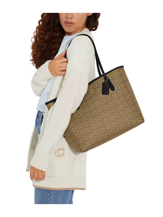 Coach City Tote Bag In Micro Signature Canvas Khaki/Black