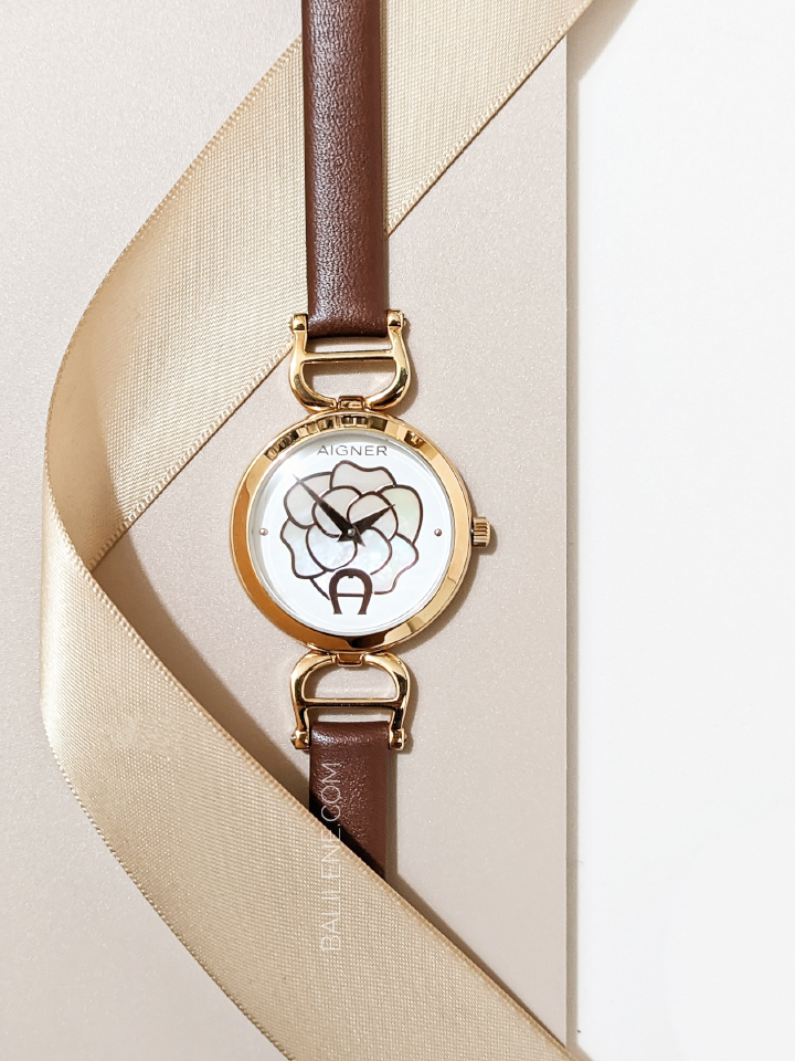 This Aigner Chieti Ladies Leather Strap Watch features a stylish fig leather strap, with a 10mm width and buckle clasp. The round, gold-tone stainless steel case measures 32mm and is 8mm thick. A mineral crystal dial in a cream color adds the perfect touch of elegance.