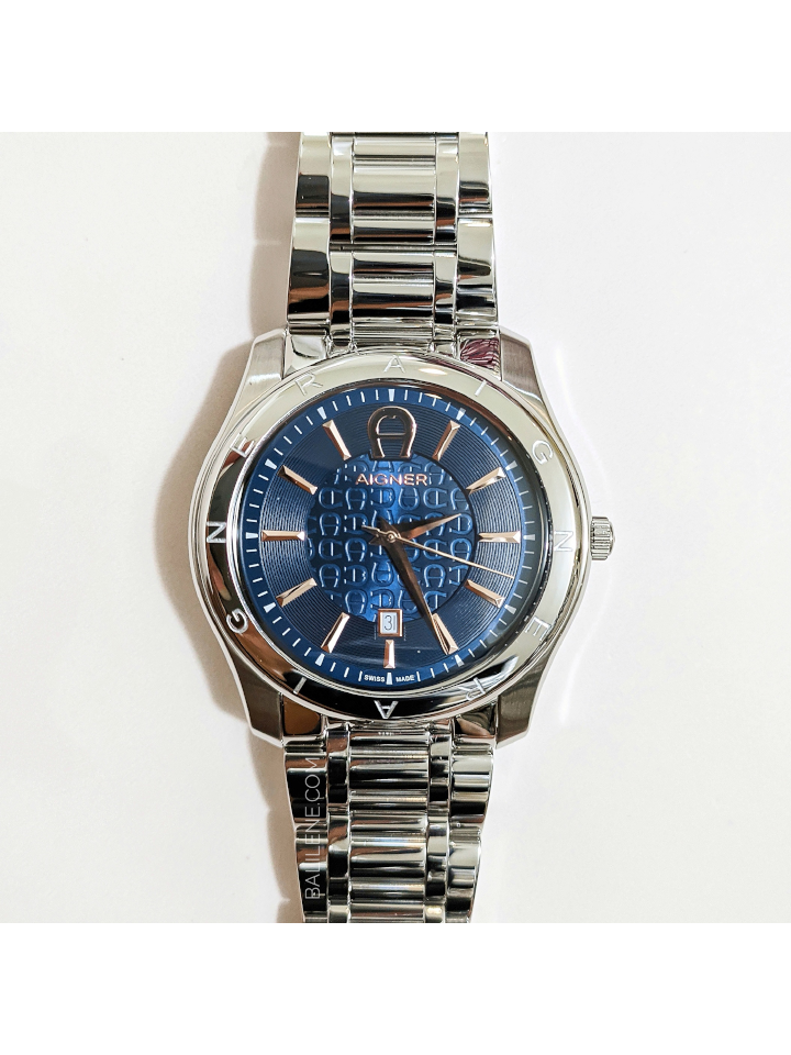 The subtle blue analog dial featuring the distinct Aigner logo adds a unique touch to its stainless steel construction.