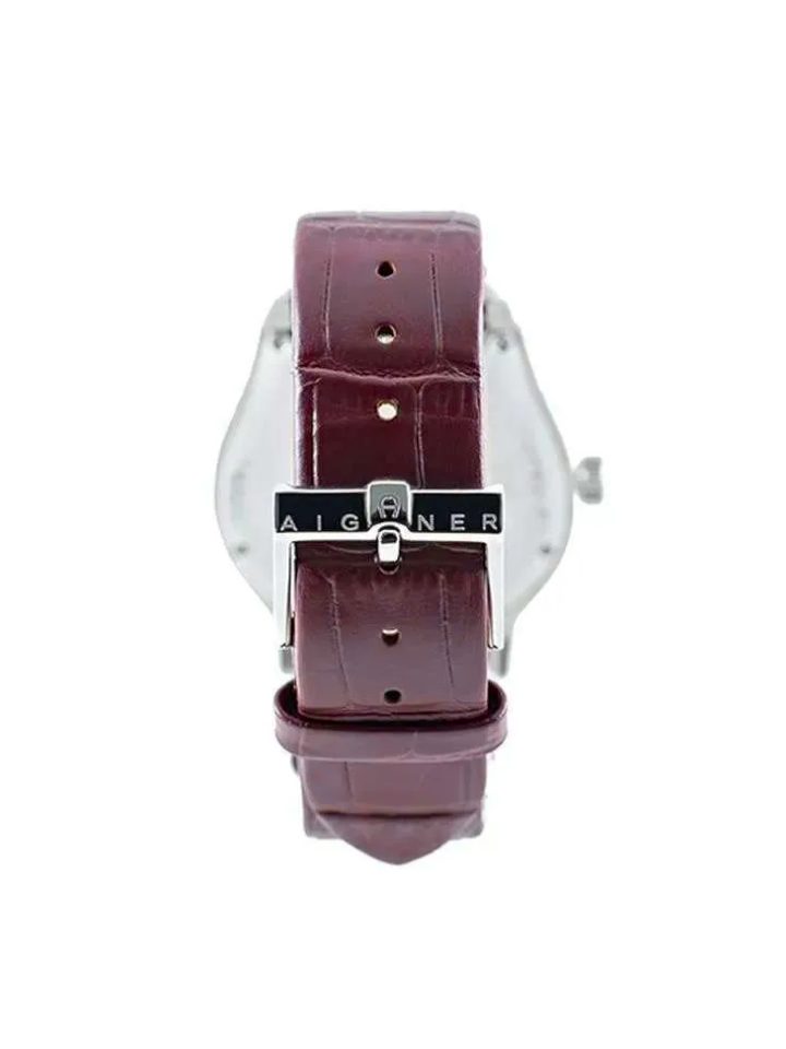 This stylish Aigner Bergamo White Dial Leather Strap watch will be a classic addition to your collection. The stainless steel case is 8mm thick and features a horseshoe-shaped dial, surrounded by a 20mm maroon leather strap with a buckle closure. The white analog dial adds a timeless touch.