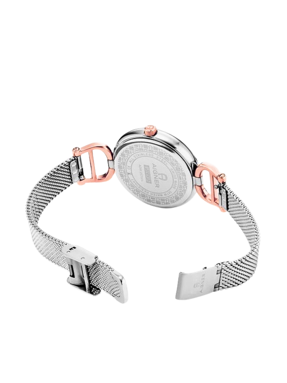The Aigner Pavia watch features a sophisticated stainless steel strap combining silver and rosegold tones, offering both durability and refined elegance.