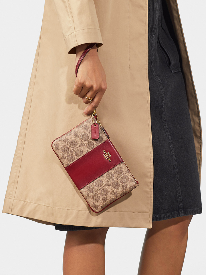 The Small Wristlet in Colorblock Signature Canvas Tan Rust is a stylish wallet with two credit card slots and a detachable wrist strap, offering versatility and convenience.