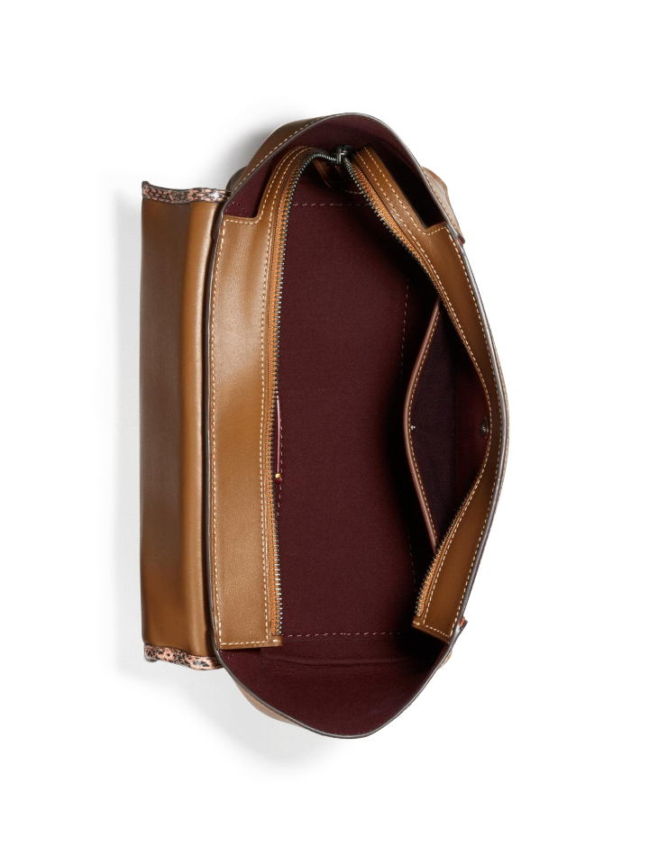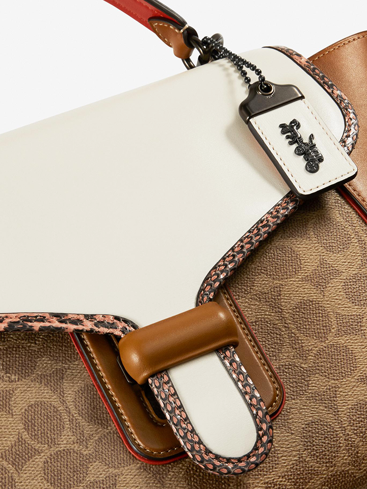 - Signature coated canvas, glovetanned leather and genuine snakeskin