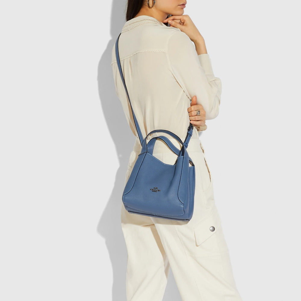 The Coach Hadley 21 Pabbled Leather Lake is a fashionable bag perfect for daily use or special occasions—with magnetic snap and doogleash clip closures, 11.5 cm drop handles, and a detachable strap with 54.5 cm drop for shoulder or crossbody wear. The polished pebble leather adds a touch of sophistication.