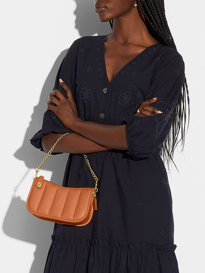 This subtle and stylish Coach Swinger bag is sure to turn heads! Crafted in luxurious Nappa leather with a quilted finish and detachable handle, it features three credit card slots, a zip-top closure and fabric lining. The Canyon color adds a sophisticated touch.