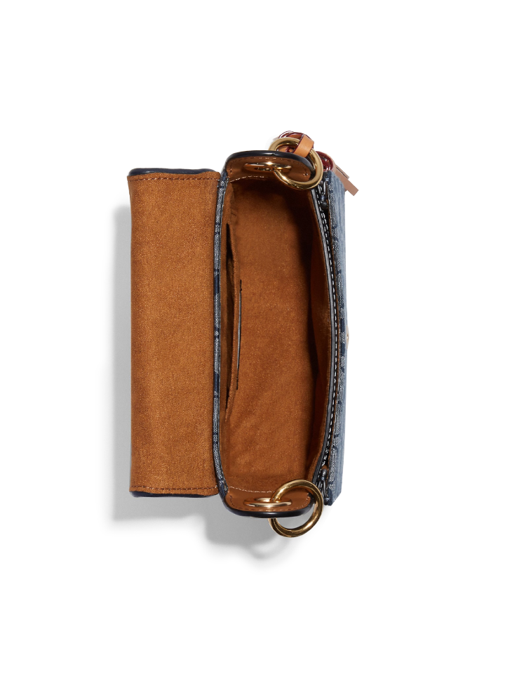 The Coach Kleo is made of signature chambray denim and smooth leather, with multiple pockets and a fabric lining. It has a snap closure, a detachable 19 cm handle, and a detachable 58 cm strap for shoulder or crossbody wear.