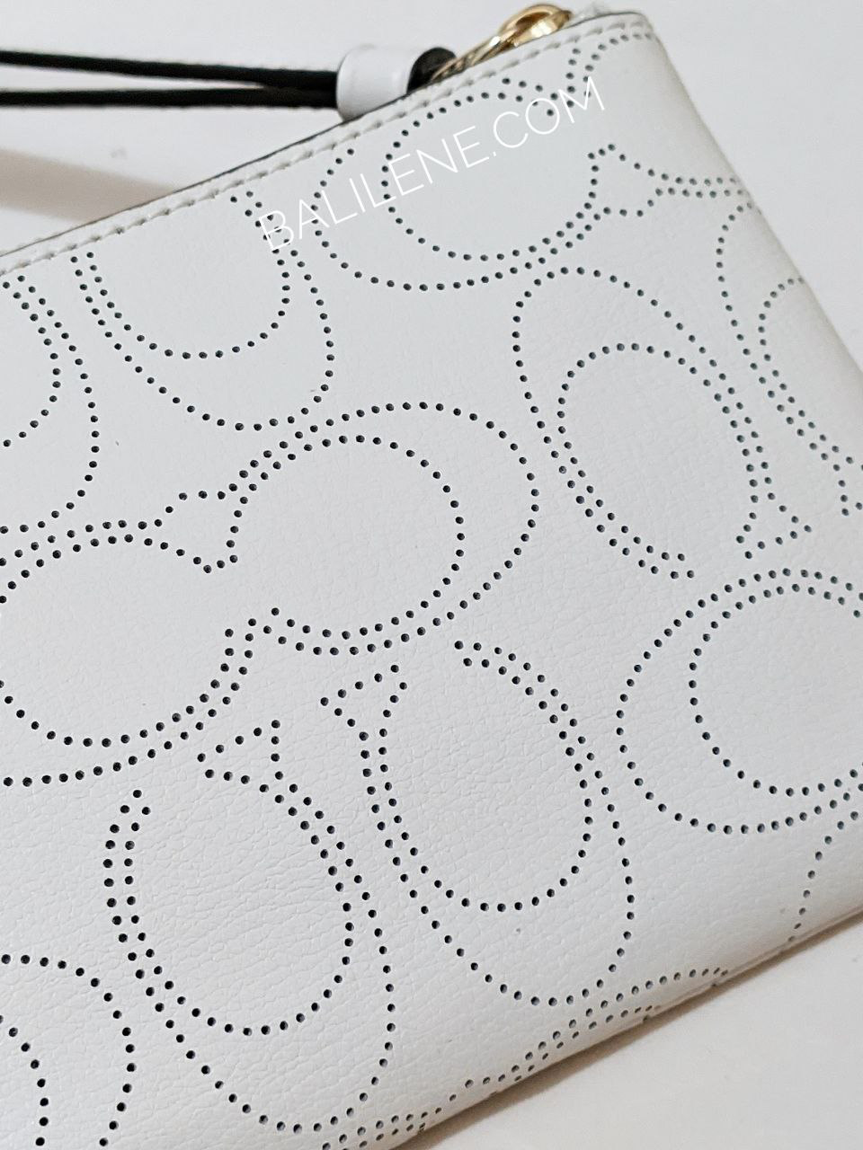The Coach Corner Zip Wristlet is crafted in signature perforated leather. Features two credit card slots, zip closure, and comes with a wrist strap.