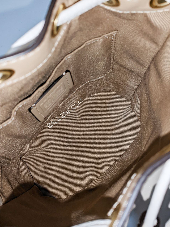 The Coach Dempsey Drawstring Bucket Bag in Signature Canvas combines timeless style with practical design. Measuring 15 inches, it features the brand’s iconic gold and light khaki chalk canvas, offering durability and a refined look.