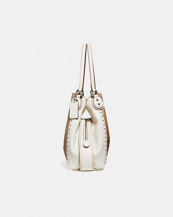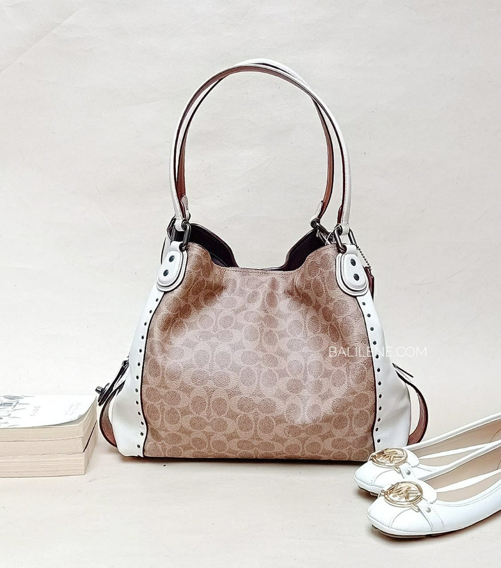 The iconic Edie shoulder bag by Coach combines downtown ease with utility. The soft, slouchy silhouette features a three-compartment interior designed for perfect organization. Finished with smooth rivets, this version is crafted from high-quality calf leather and Coach's signature canvas with logo print.