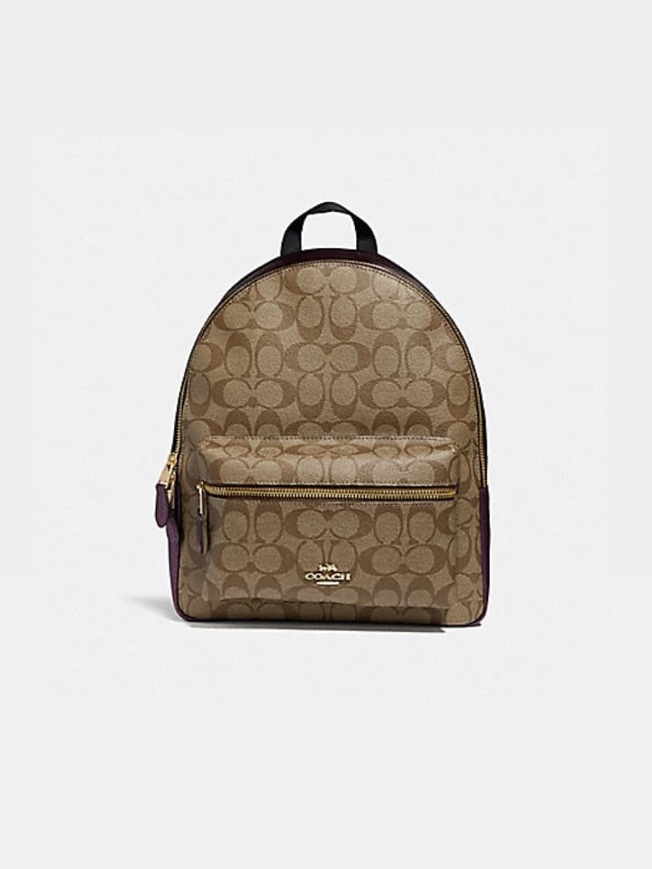 The Coach Charlie Medium in Khaki Metalik Raspberry blends timeless sophistication with modern edge. Crafted with metallic raspberry accents, this medium-sized bag offers a striking yet versatile look.