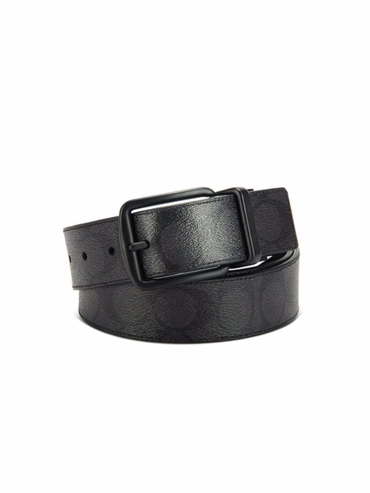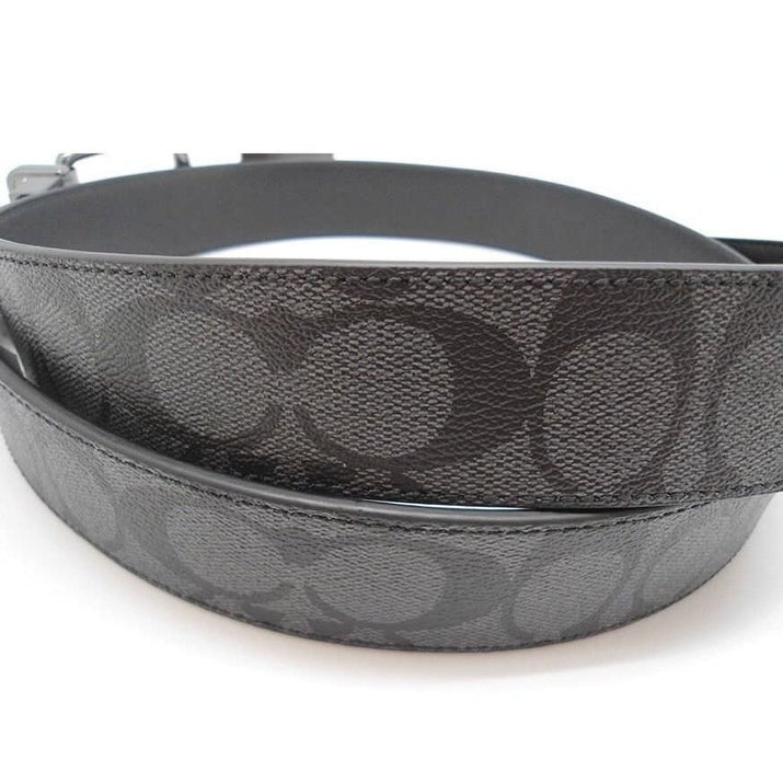 The Coach Wide Harness Reversible Signature Coated Canvas Belt in Charcoal Black combines timeless design with versatile functionality. Crafted from signature coated canvas, this belt offers durability and a refined texture.