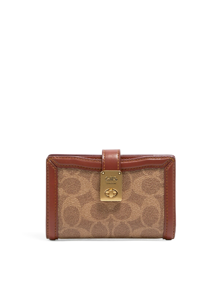Coach Hutton Wallet In Signature Canvas Tan Rust is a signature canvas wallet in light brown and orange accents, featuring the famous Coach logo. Perfect for storing credit cards, cash, and other small items.