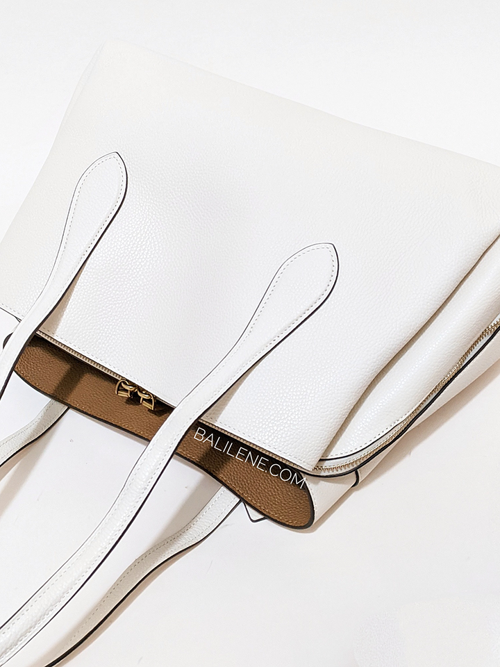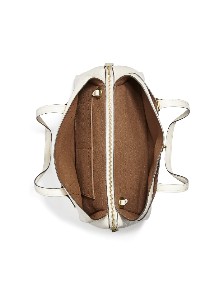Featuring side open compartments and handles with a 21.5 cm drop, it also has an outside turn lock pocket for easy access. This carryall is available in a stylish Chalk hue.