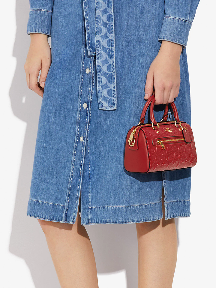 The Mini Rowan bag is made of embossed leather featuring a zip closure on top, fabric lining, double handles, a long adjustable and detachable strap, two card slots, and a metal Coach logo.
