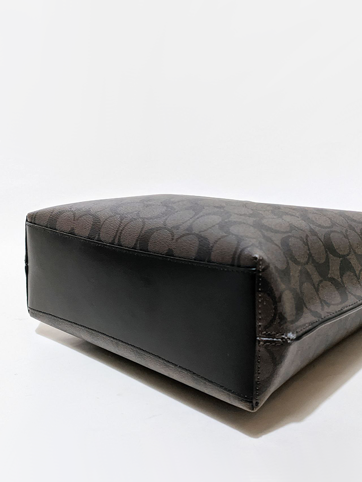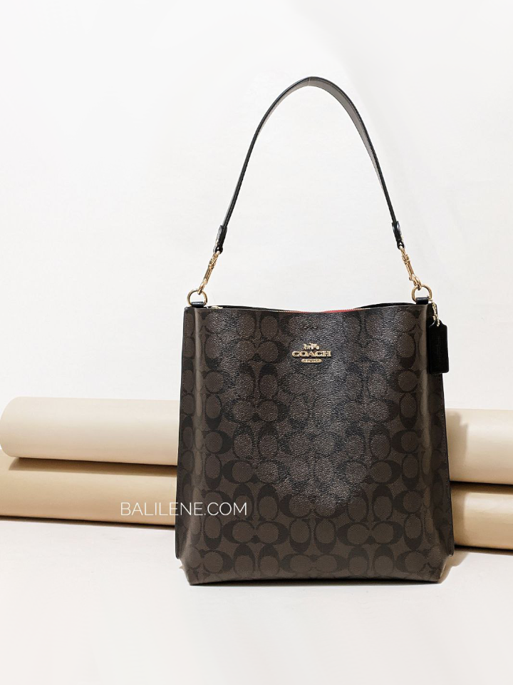 This stylish bucket bag from Coach comes in signature coated canvas and smooth leather for a polished look. Center zip compartment and snap closure keep belongings secure. Detachable handle and adjustable strap make it lightweight and comfortable to wear. Brown Black hue adds a modern touch to any look.