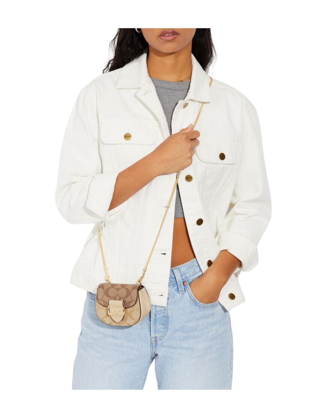 This stylish card case from Coach is the perfect accessory for any occasion. Crafted with signature coated canvas and smooth leather, it features a snap closure and fabric lining. It comes with a chain strap for convenience and has a Light Khaki/ Ivory Multi color combination. Size: 12 x 8 x 6 cm.