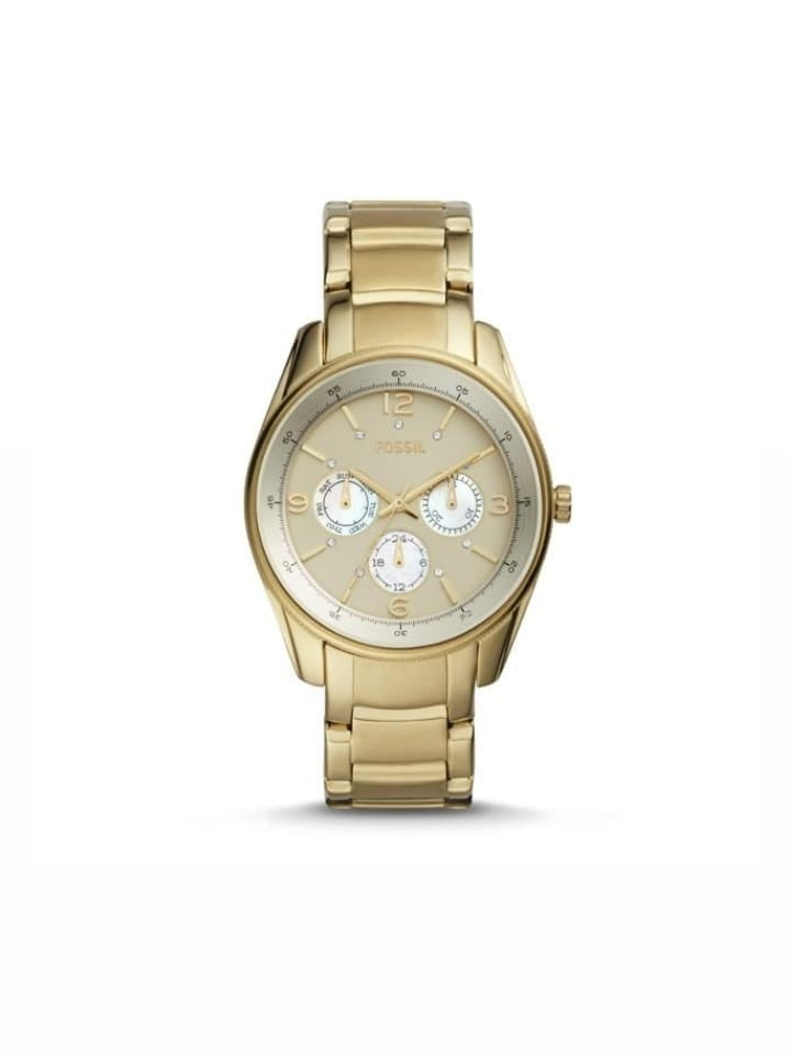 - Stainless steel case dengan diameter 39 mm dan ketebalan 13 mm. Jam tangan Fossil ini menampilkan dial gold dengan fungsi hari dan tanggal.