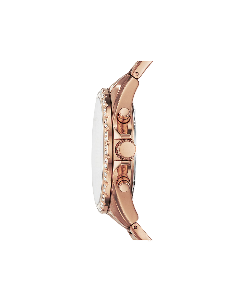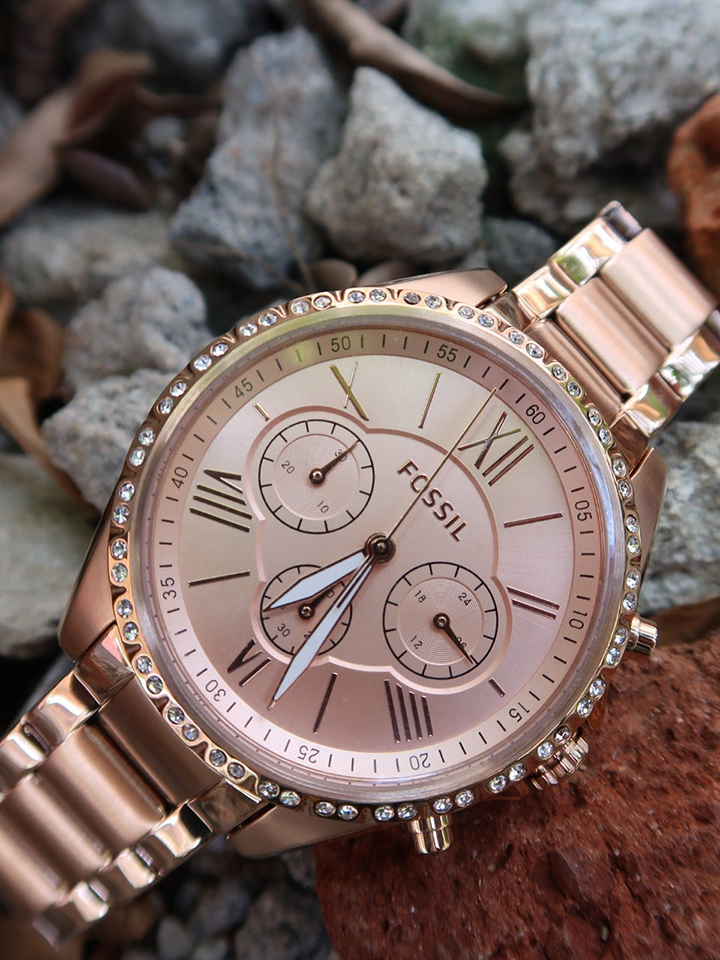 Stay on time and on trend with this Fossil BQ3377 Modern Courier Chronograph watch, featuring a rose gold-tone stainless steel strap and case, screw down case back and a chronograph dial—all luxuriously framed by a 40mm case size. Stay stylish, secure and on-time with Fossil.