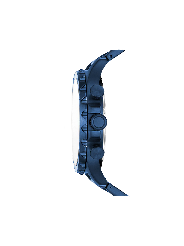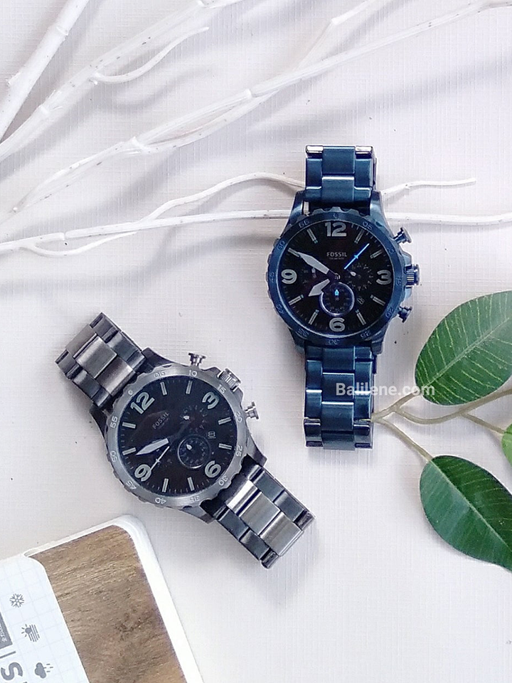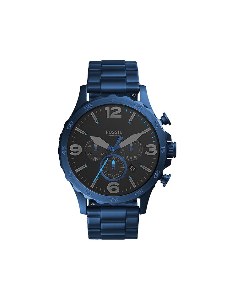 This Fossil JR1530 Nate Chronograph watch has a stylish blue stainless steel strap and case, both with a push button clasp for easy wearing. A 50mm round case provides a perfect stage for the black chronograph dial with mineral crystal. The case thickness is 11mm with a screw down case back for reliability. Enjoy fashion and function with this stylish time piece.
