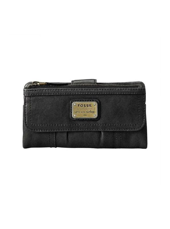 Fossil Emory Clutch Purse In Black leather. Has flap top slip pocket on front. Zip top coin section. Tab closure opens the rear, has 11 credit card slots, an ID window, zipped coin section and slip pocket for receipts. Inside is lined in Black cotton fabric. Nice brass finish Fossil Vintage logo.