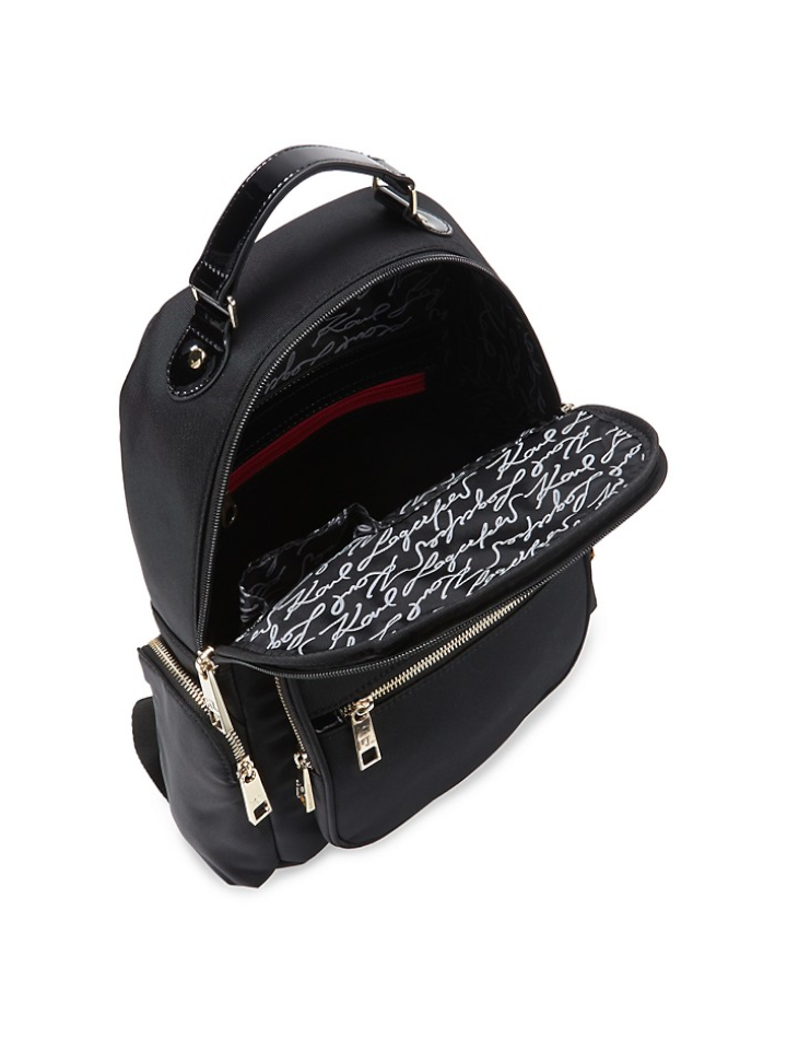 The Karl Lagerfeld Travel Backpack in black combines sleek design with practical functionality. Crafted for the modern traveler, it offers ample storage and organized compartments to keep essentials secure and accessible.