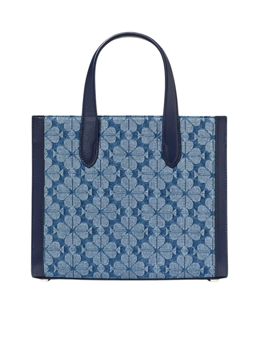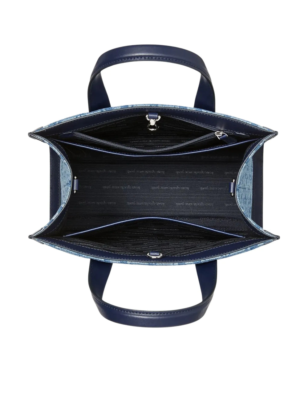 This Kate Spade Flower Jacquard Denim Manhattan Small Tote in Parisian Navy combines refined design with everyday practicality.