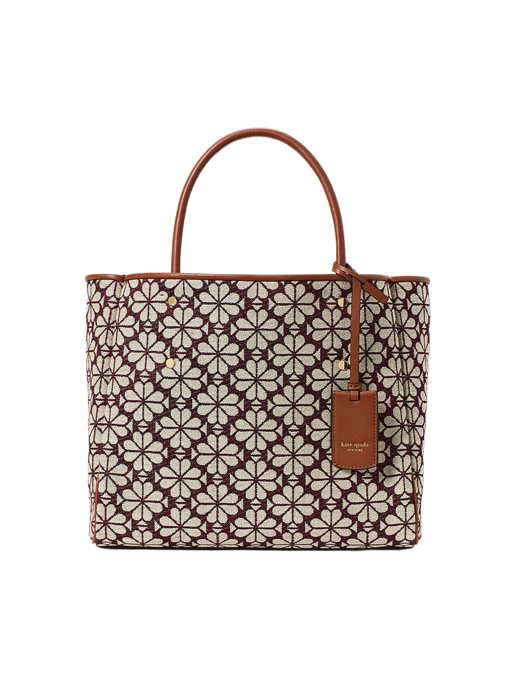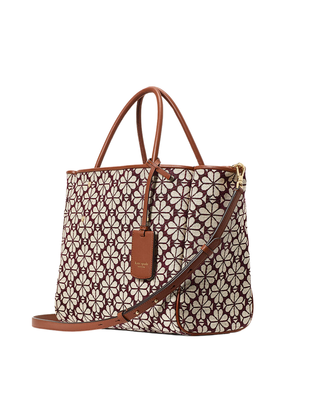 This Kate Spade tote bag features a stunning burgundy multi-colored flower jacquard design. With a medium size, it is perfect for everyday use, offering both style and functionality. Expertly crafted with high-quality materials, this tote bag is a versatile and elegant addition to any wardrobe.