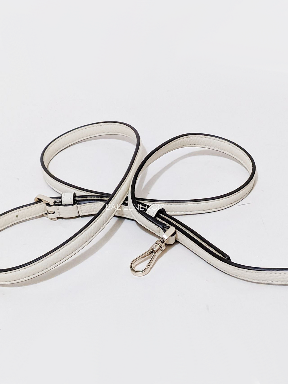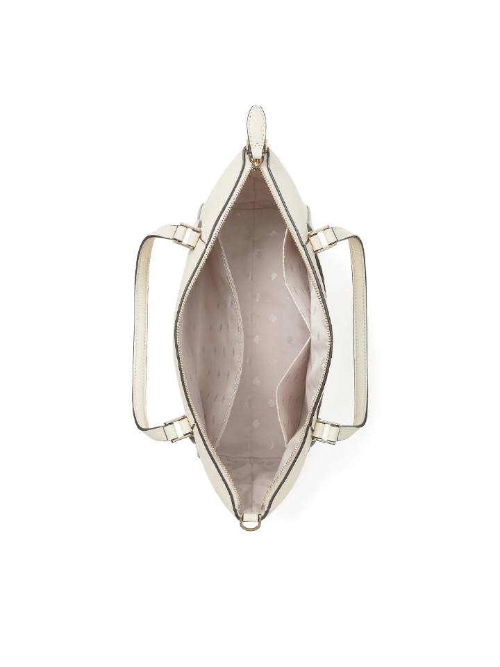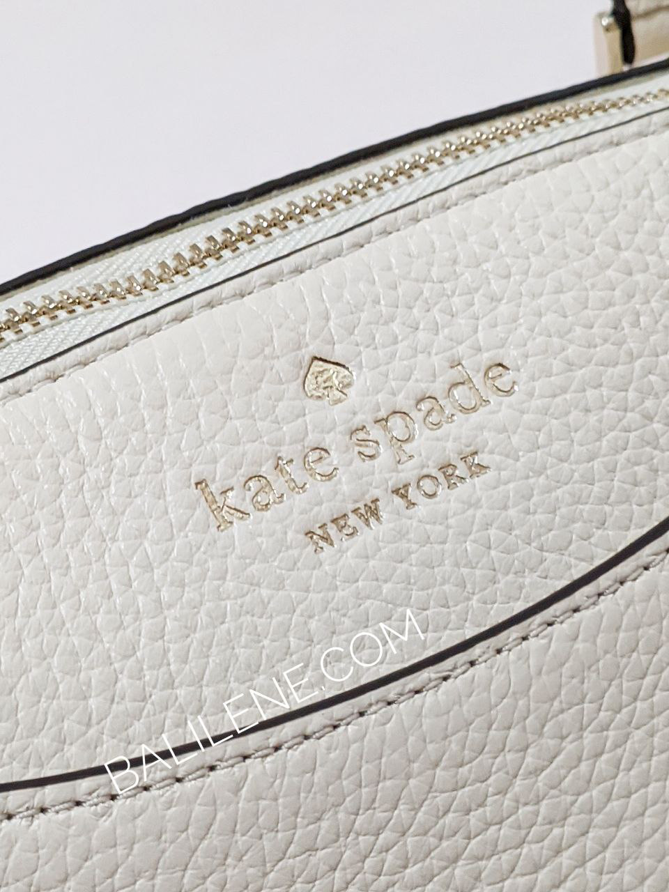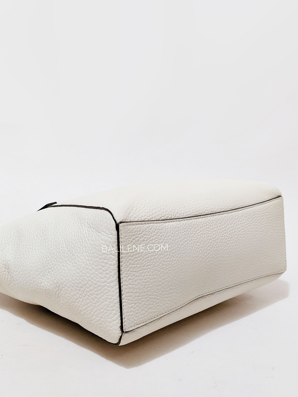 The bag is made of pebbled leather and comes with double handles and an optional long strap. It has a large compartment with a two-way spade jacquard lining, which includes a zipper pocket and a slip pocket. Additionally, the bag features a convenient front slip pocket for easy access to essentials.