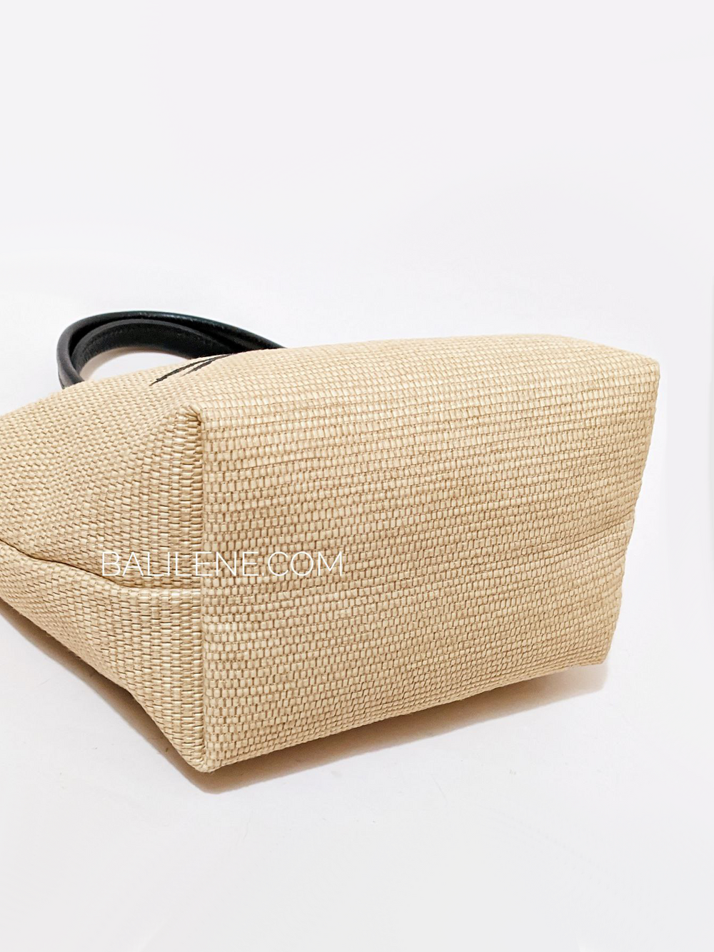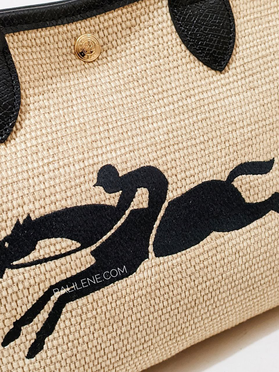 Le Pliage basket combines elegance and casual style with an embroidered Longchamp horse, attachment rings for a shoulder strap, and a straw-effect canvas, celebrating summer with embroidered details for a refreshing and versatile look.