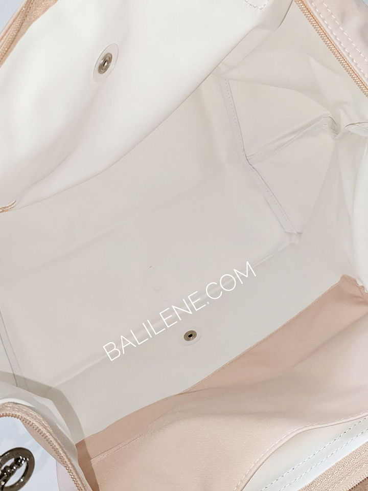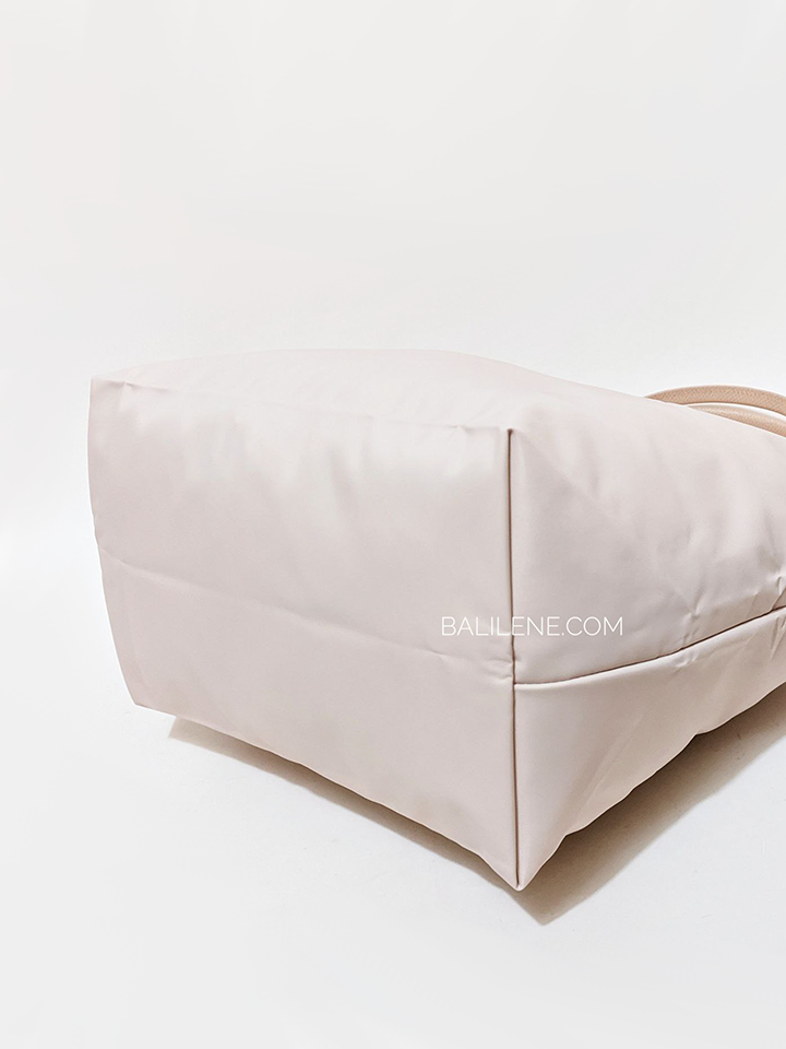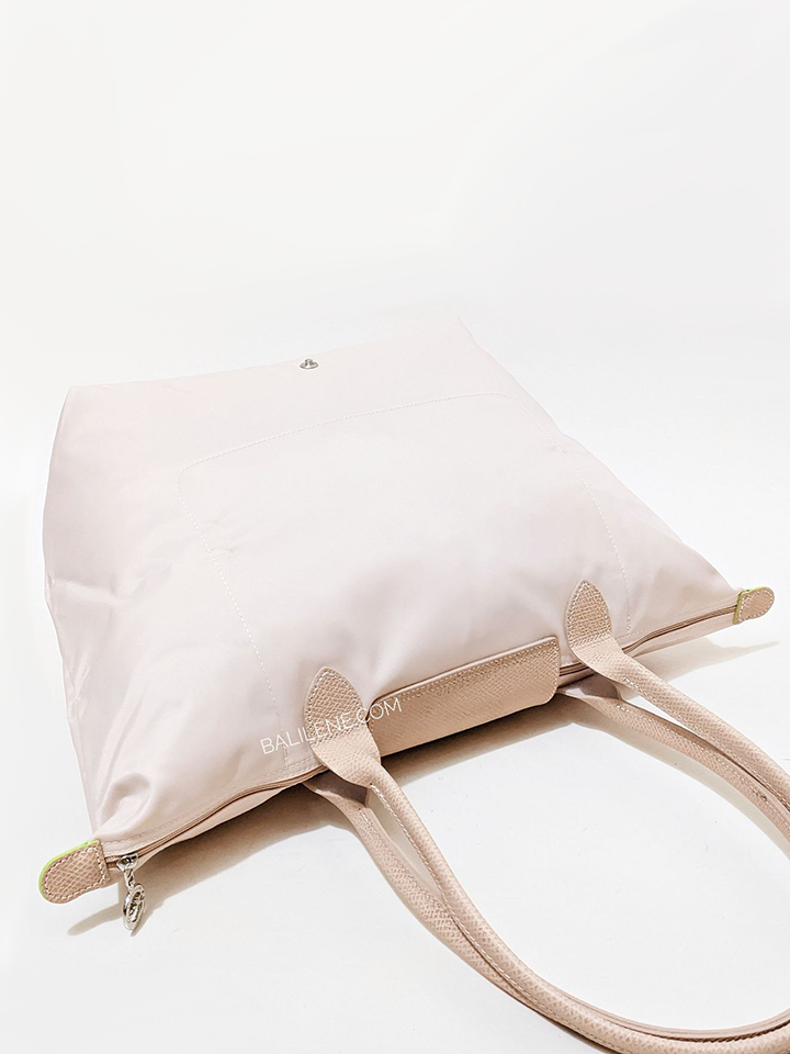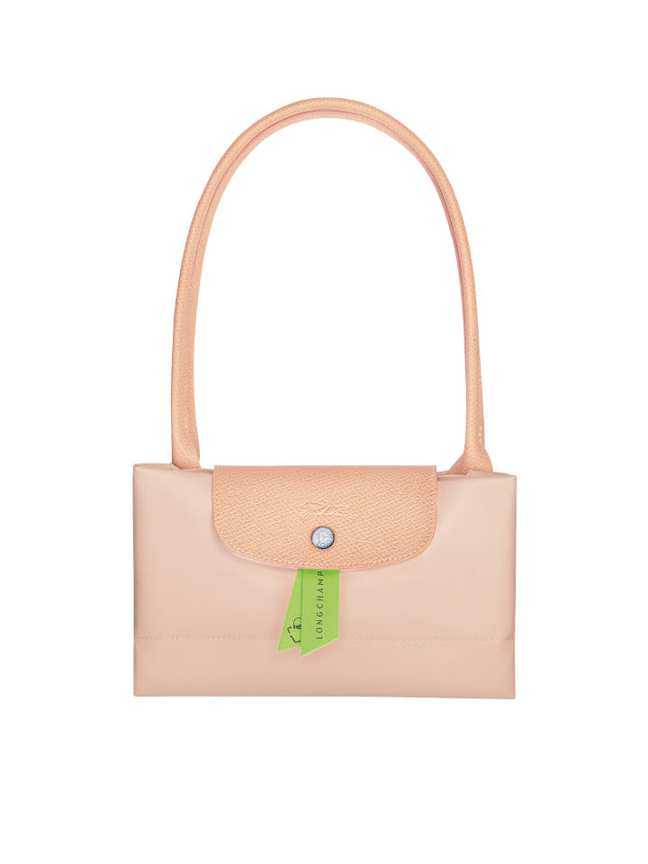 Eco-friendly Longchamp's Pliage Green tote bag with recycled polyamide canvas, horse embroidery and leather trim. It has a minimalistic silhouette, long handle and zip closure, with green edges as a symbol of eco-friendliness.