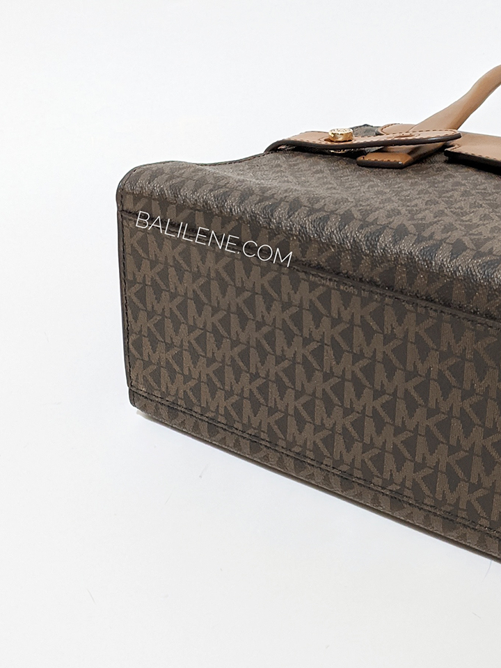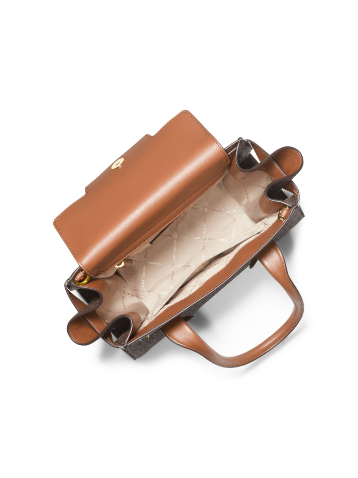 The Michael Kors Carmen Medium Satchel in brown features a sophisticated logo-accented design combined with luxurious faux leather. Its structured silhouette and belted detail offer a polished look, perfect for elevating everyday outfits.