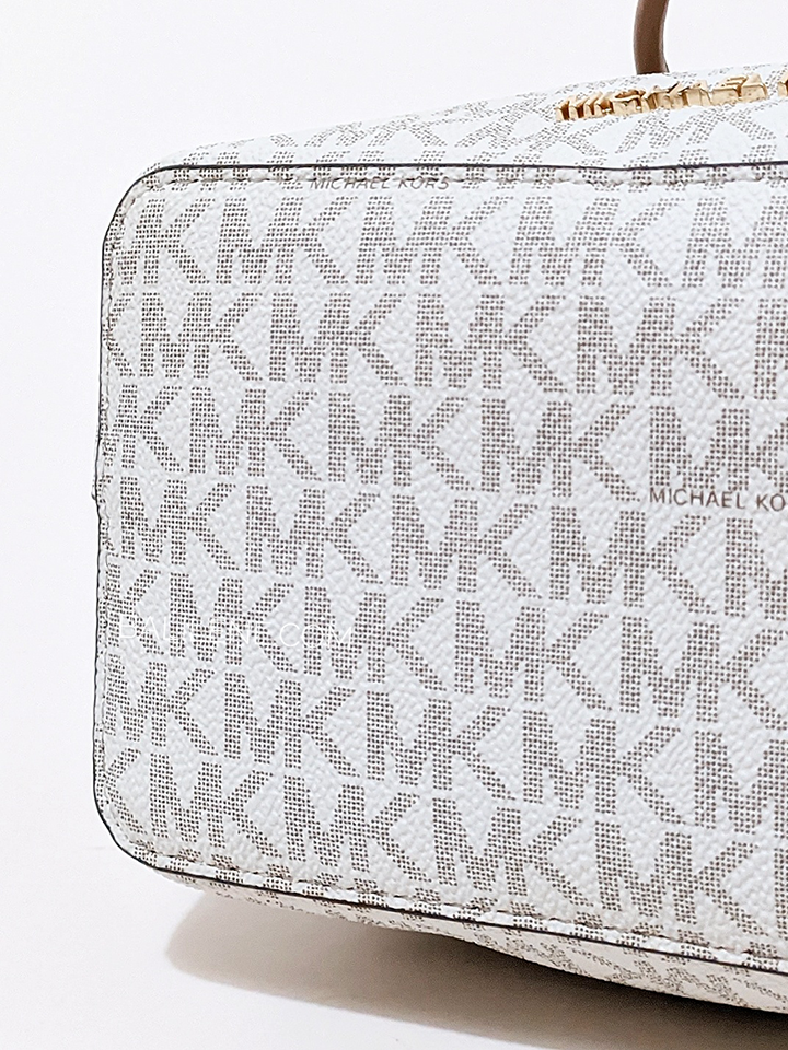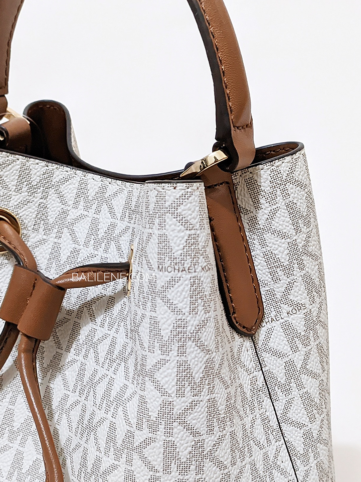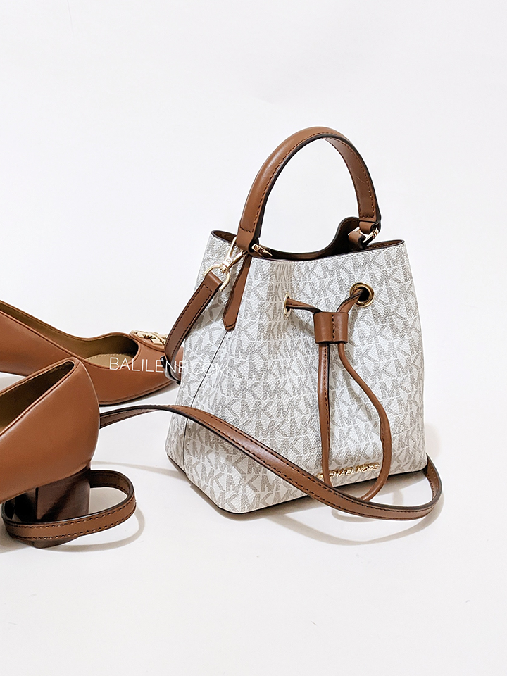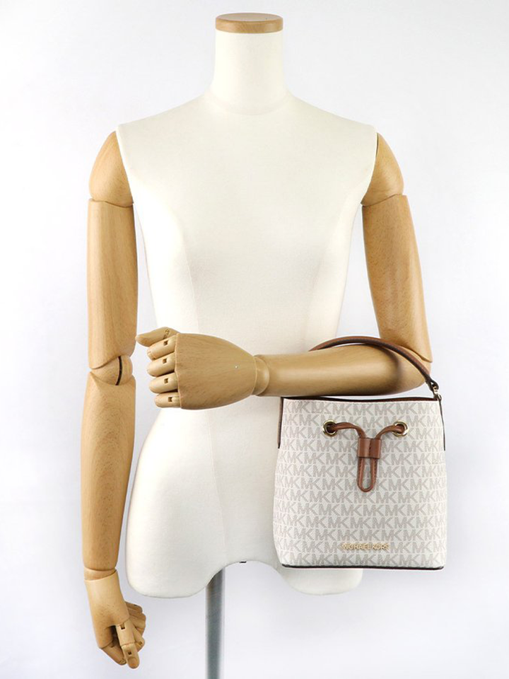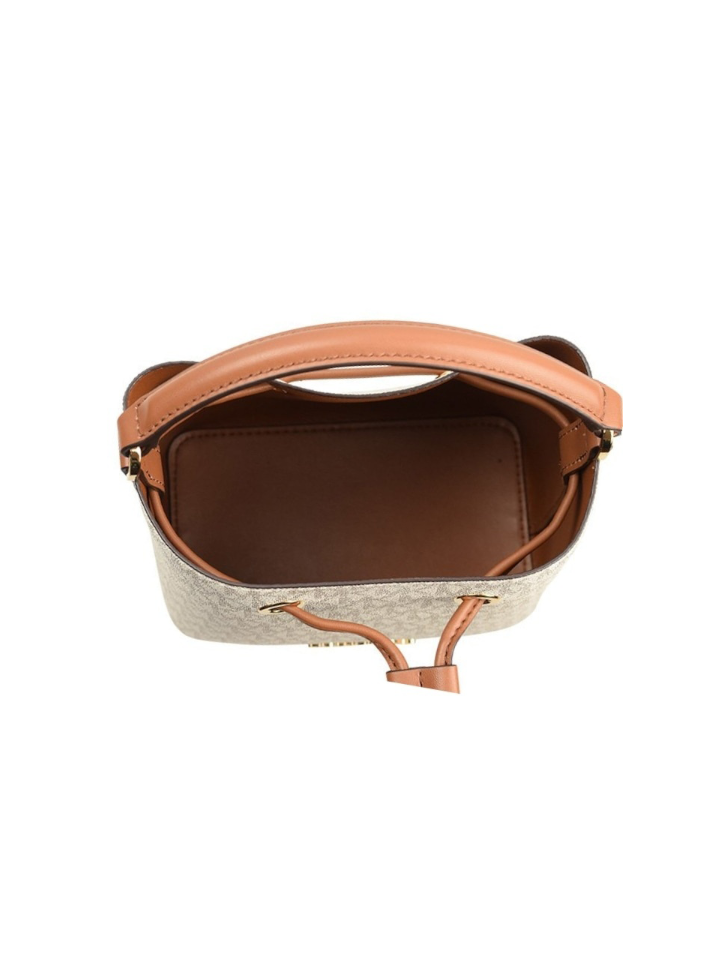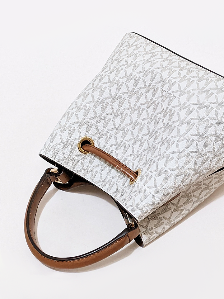 This timeless Michael Kors Suri small logo crossbody bag in Vanilla adds a classic touch to any look. Durably crafted in canvas and polyester, it features gold-tone hardware and a drawstring fastening. With an interior back slip pocket, it's ideal for stylishly carrying your essentials.