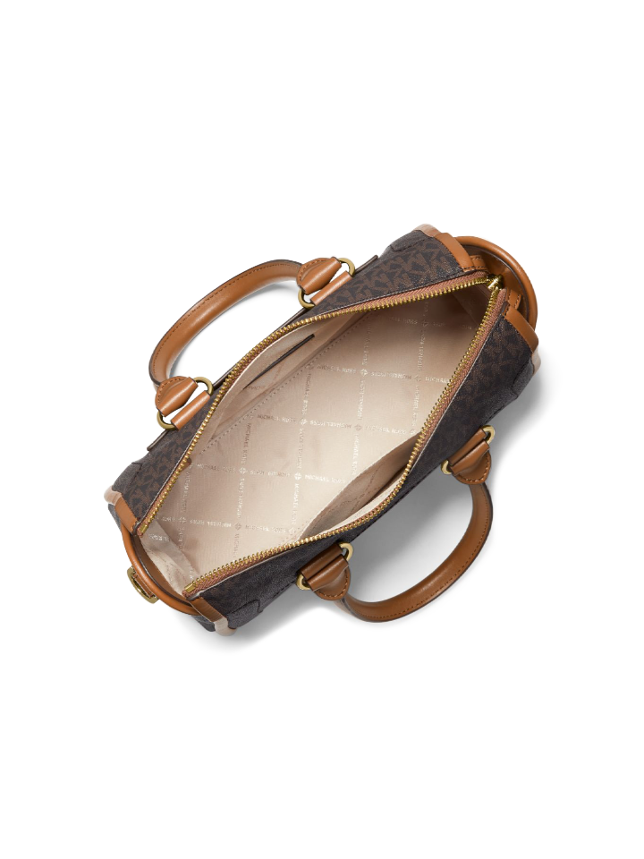 Look your best carrying the Michael Kors Carine Medium Logo Satchel. This stylish bag is crafted from logo-print canvas with gold-tone hardware, and features a detachable crossbody strap and adjustable shoulder strap for convenient carrying. Multiple pockets and a zip fastening keep your belongings secure and organized.