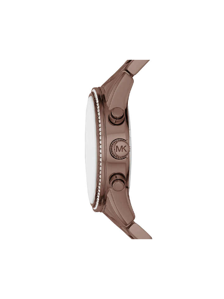 This chic Michael Kors MK6529 Ritz watch features a brown stainless steel strap which fastens with a two-pusher foldover clasp. The round, brown stainless steel case is 37 mm in size and 11 mm thick, and is topped with a mineral crystal dial. Enjoy the convenience of the chronograph design with the stylish brown dial.