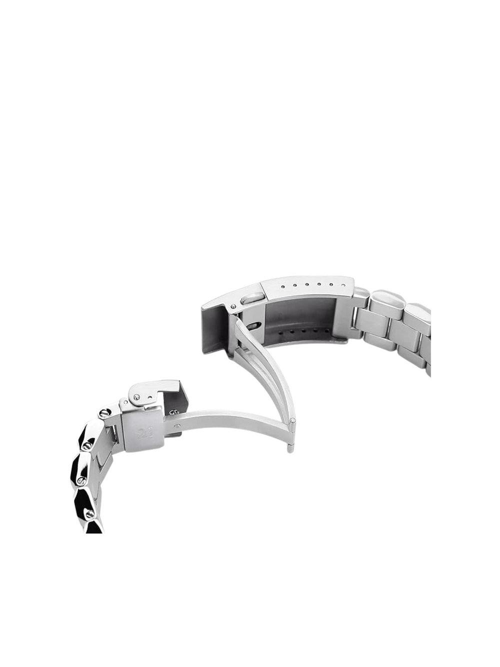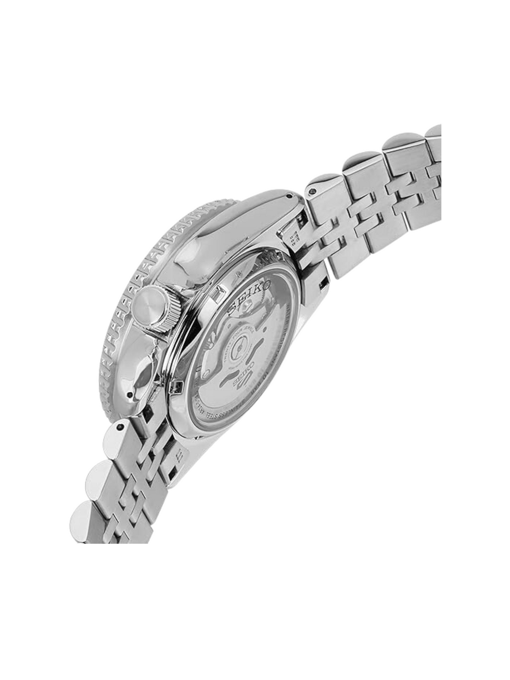This Seiko 5 Sports Automatic GMT watch features a stainless steel blue strap and silver case for a stylish and durable look. It's powered by an automatic GMT movement with manual winding capability, a hardlex crystal with lens, and a date window with magnified glass at the 3 o'clock position. It's also water resistant up to 10 ATM/100 meters.