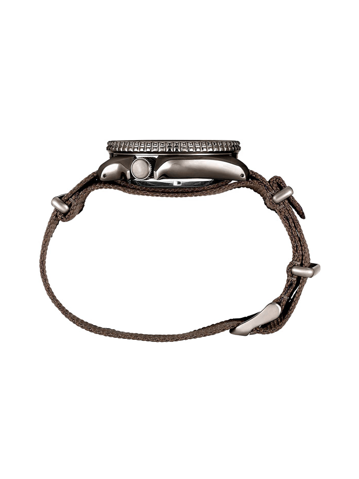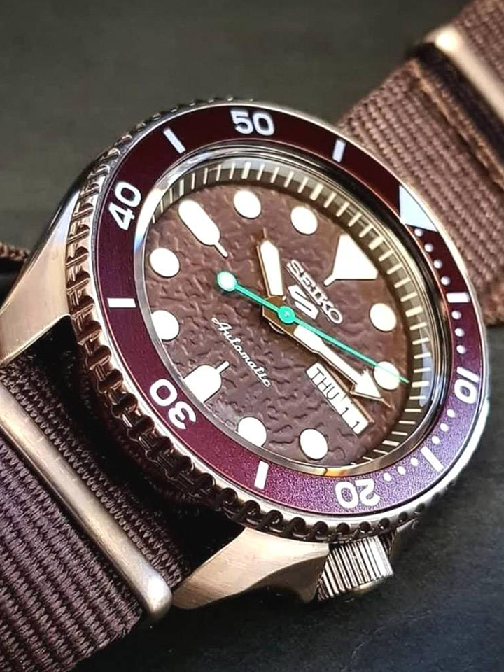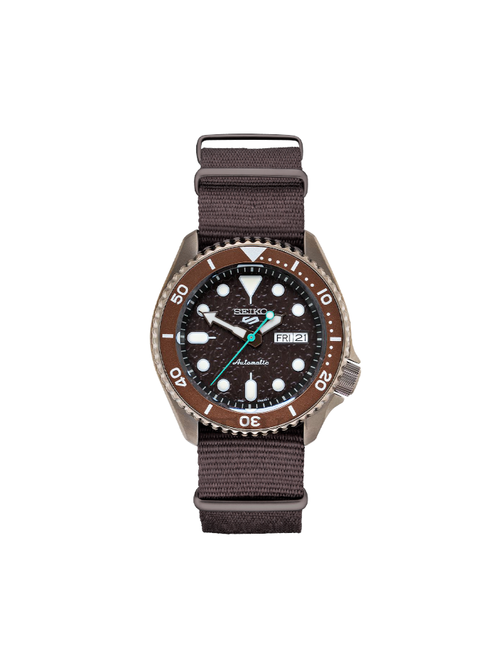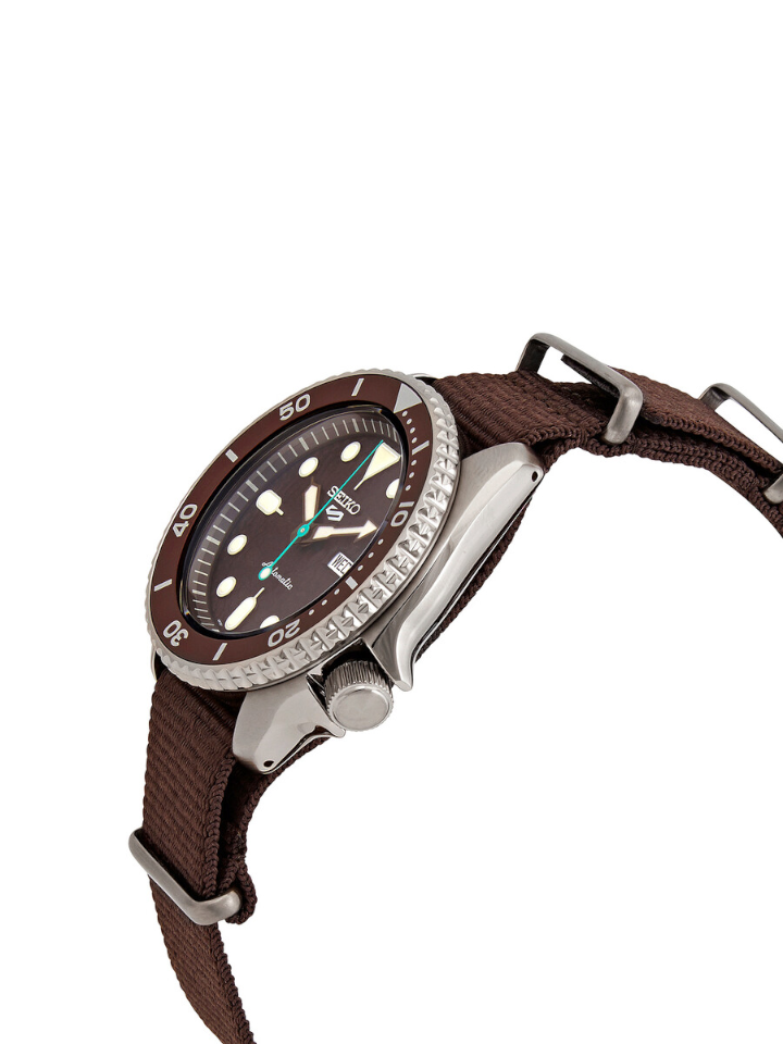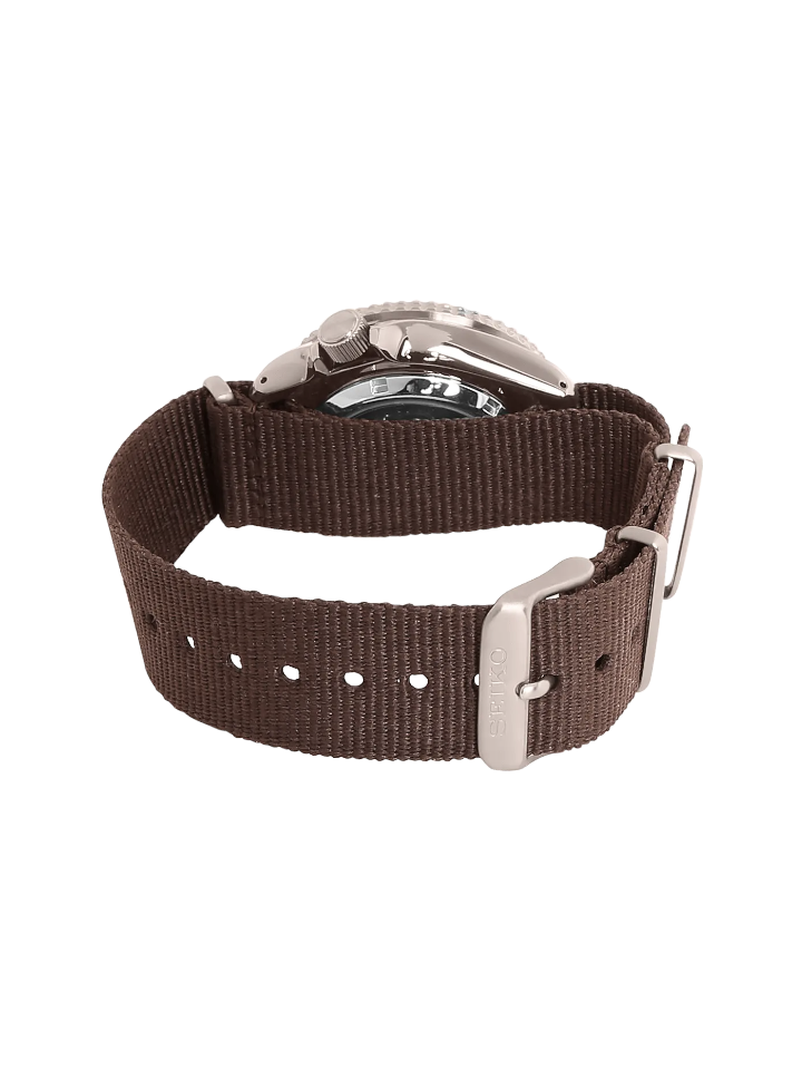 This Seiko 5 Sports SRPD85K1 watch features a 42mm stainless steel case, 13mm thickness, hardlex crystal dial window, and automatic brown dial. The watch has a 22mm brown nylon strap with a buckle closure for a secure fit. A screw case back ensures your timepiece will last.