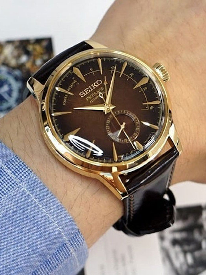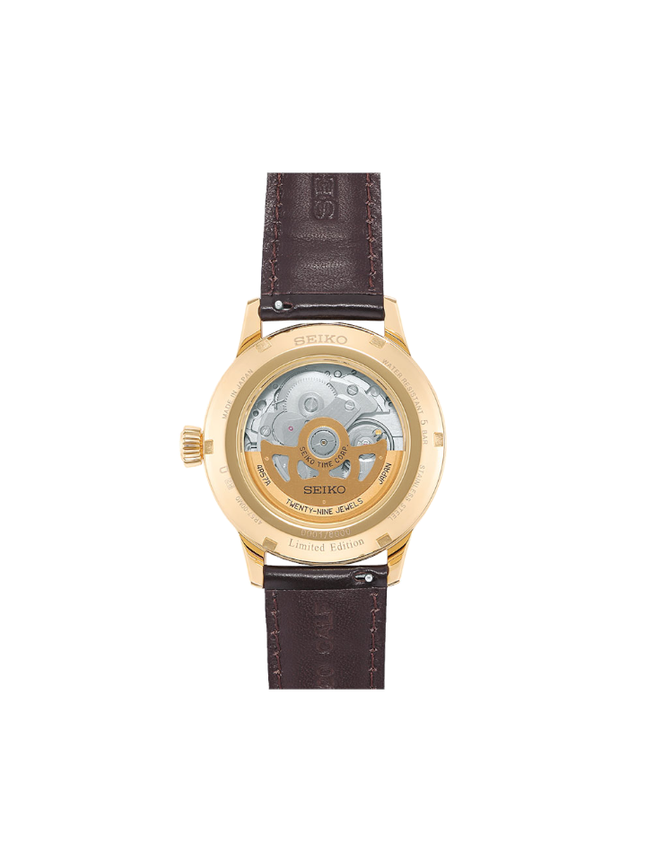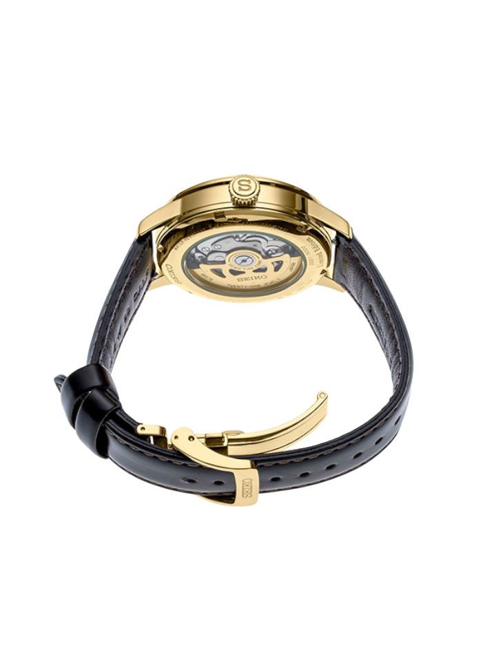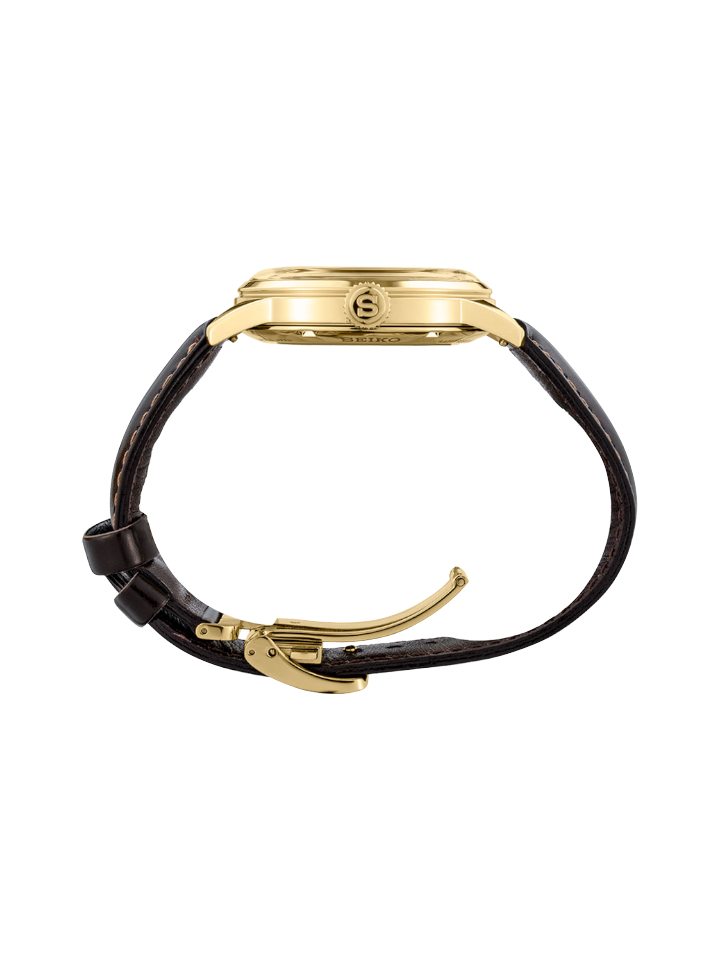 This limited edition Seiko Presage features an automatic brown dial with a gold 40.5mm stainless steel case and a luxurious 20mm leather strap. The three-fold clasp with push button release allows for a secure and comfortable fit. Scratch-resistant sapphire crystal and a mineral case back offer lasting protection.