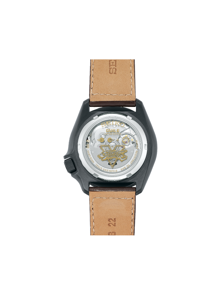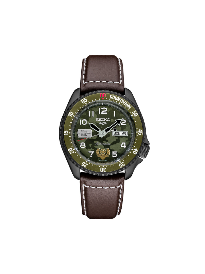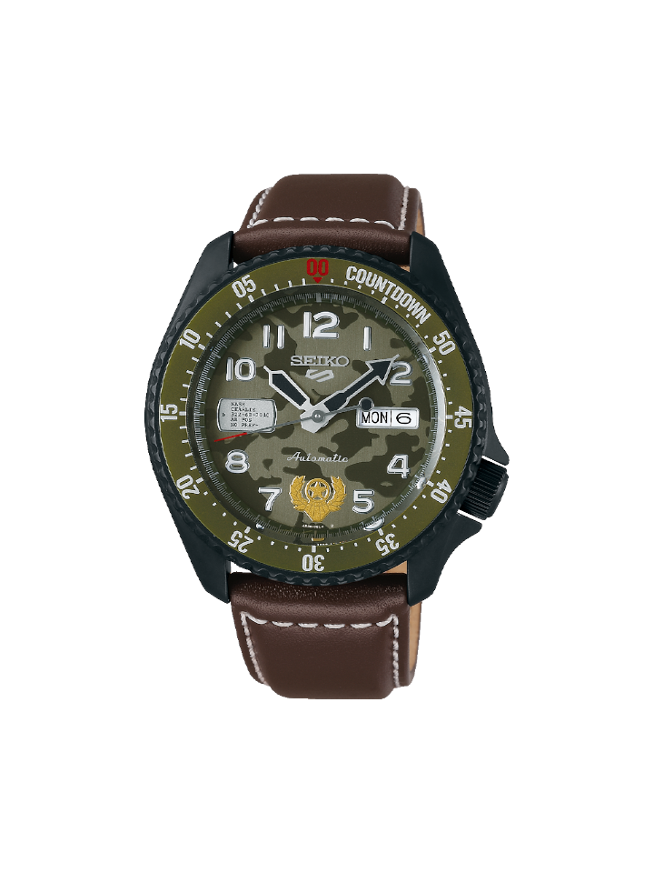 Stay ready for any mission with the Seiko 5 Sports SRPF21K1 automatic watch. Featuring a 42mm stainless steel case, 13mm thickness, and Hardlex Crystal, this stylish timepiece has a round black case and army green dial with an indestructible fortress pattern. A durable brown leather strap with a 22mm width and buckle closure ensure a perfect fit.