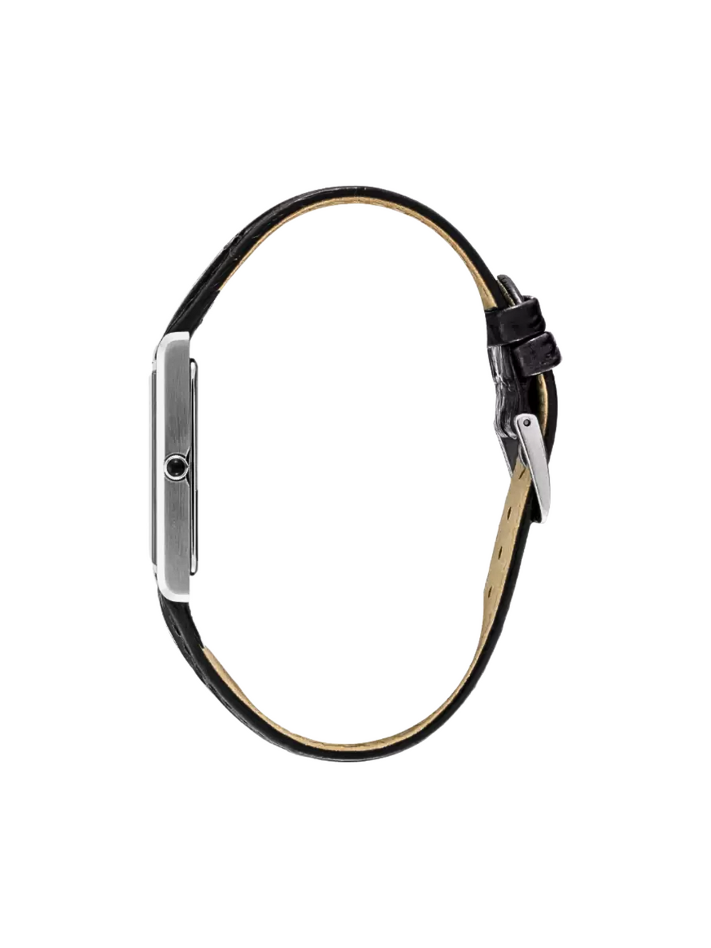 The Seiko features a refined silver case complemented by a black leather strap, combining classic design with modern precision.