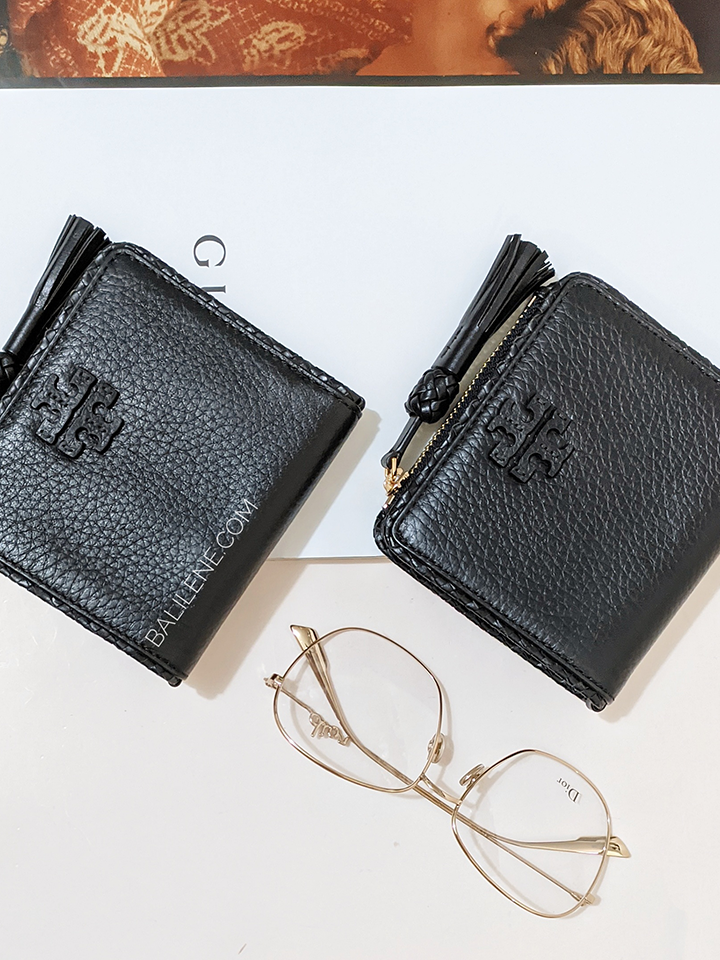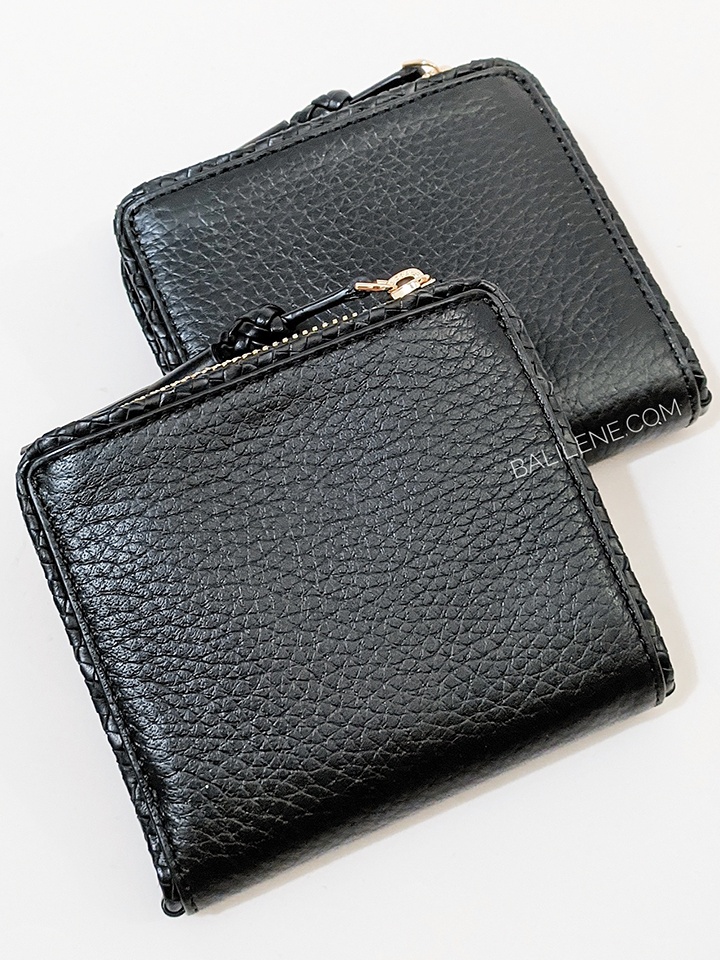 • Leather exterior features logo accent and side zip pocket with tassel pull