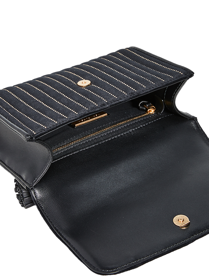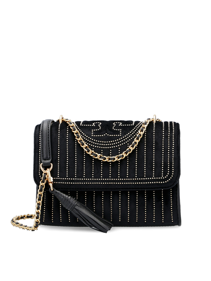 The Tory Burch 56277 Fleming Mini Stud Velvet Small Shoulder Bag in Black combines elegant design with refined craftsmanship. Crafted from plush velvet, this compact shoulder bag features distinctive stud detailing, adding a subtle edge to its classic silhouette.