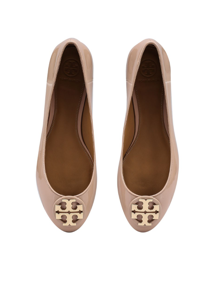 The Tory Burch Claire Ballet Flat in Patent Leather Goan Sand combines timeless elegance with expert craftsmanship. Featuring a sleek patent leather upper in a warm sand hue, this flat offers both refined style and everyday comfort.