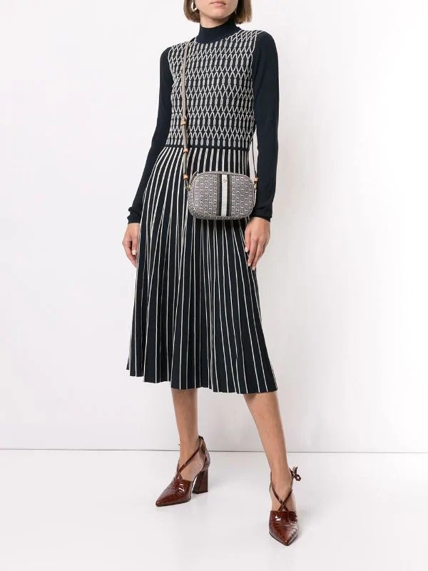 • Crossbody bag realized in coated canvas enriched  fabric insert and metal logo at the front