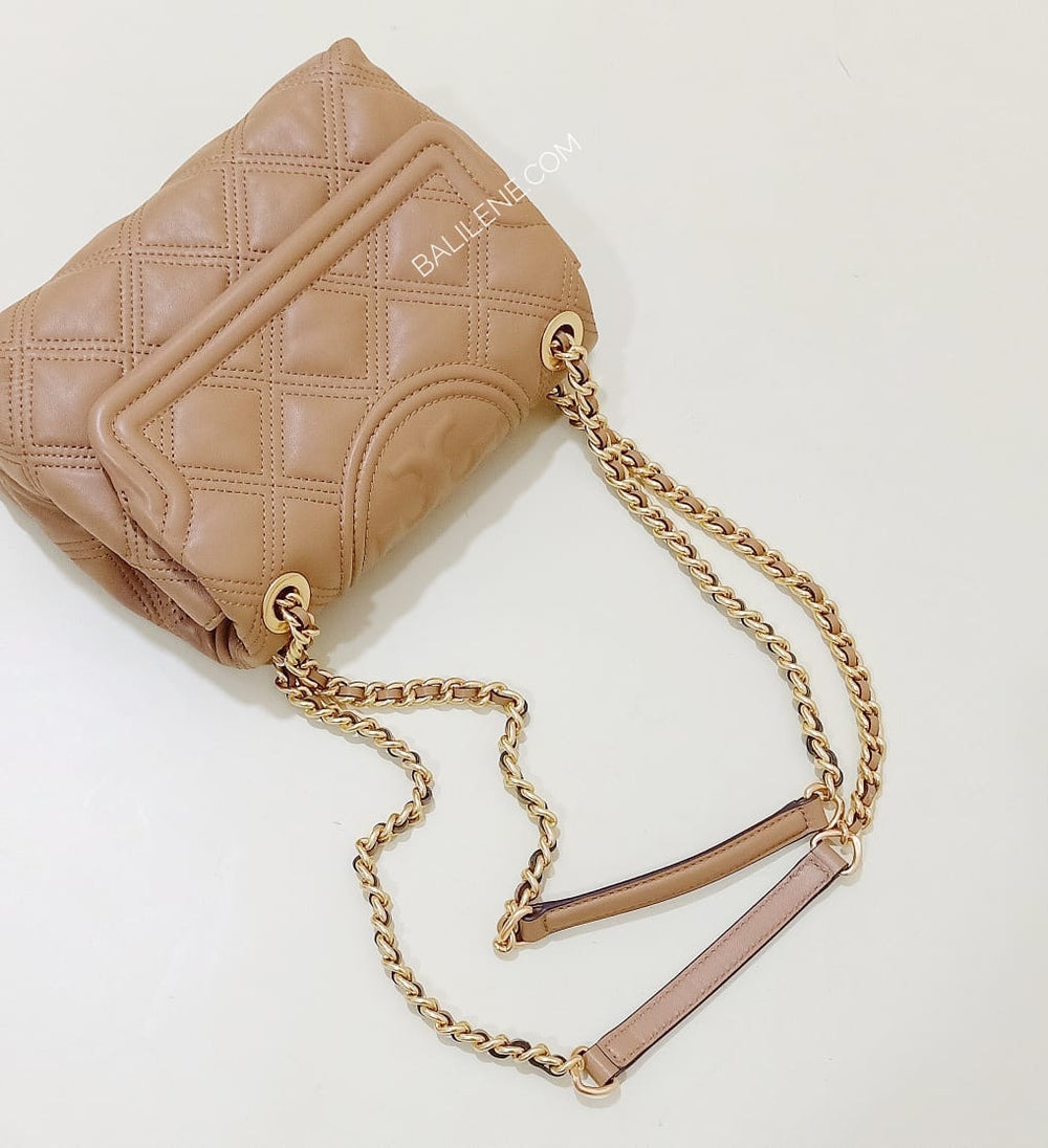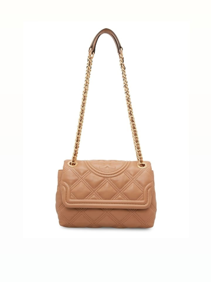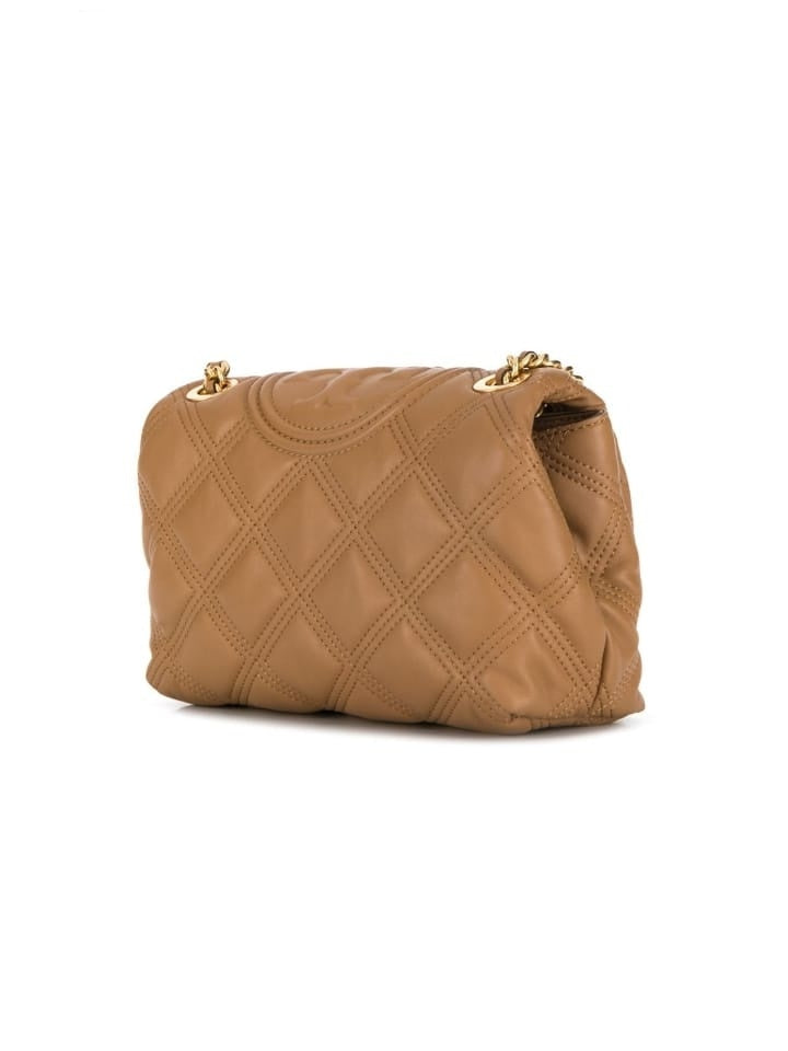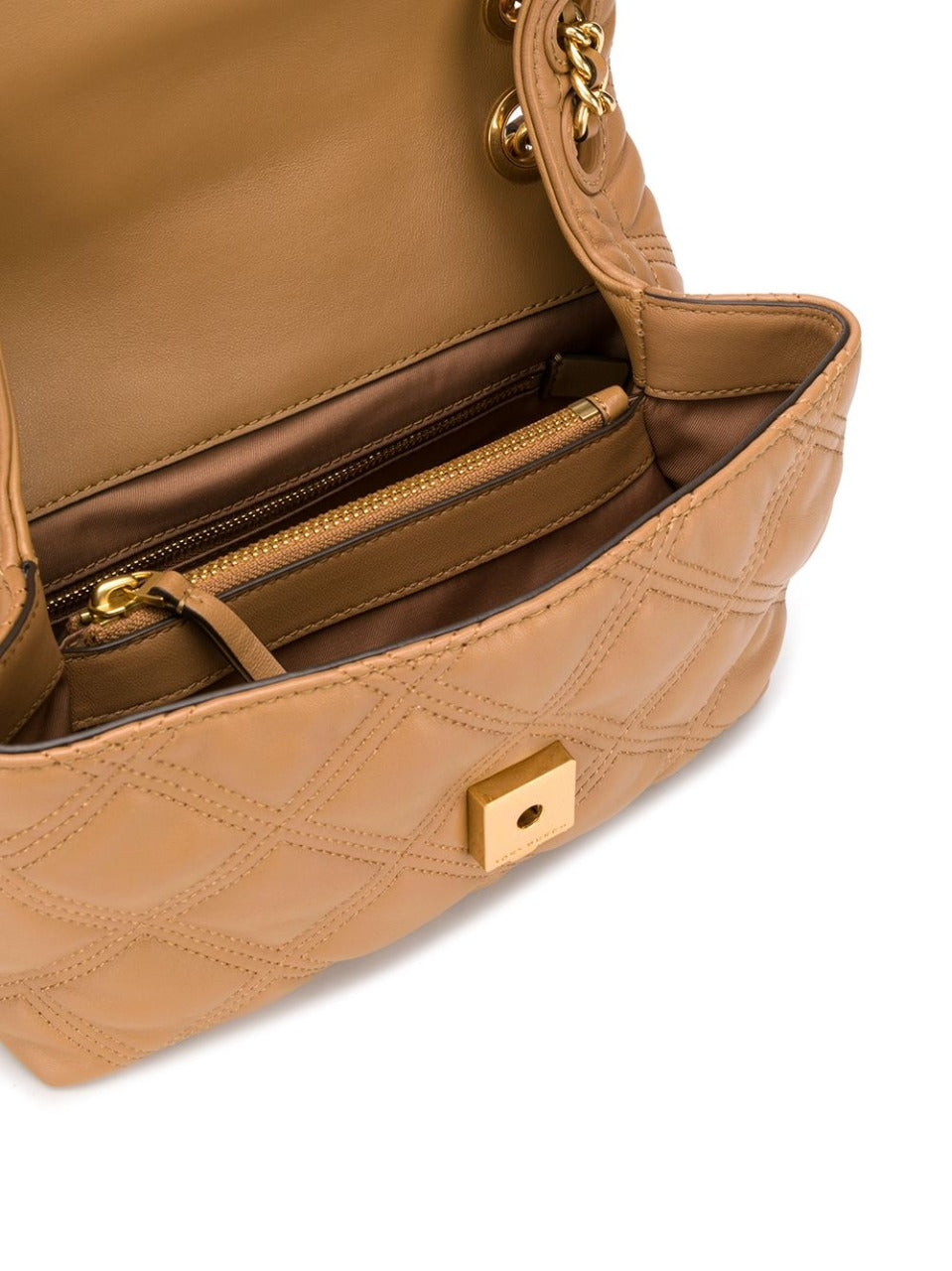 The Tory Burch 58102 Fleming Soft Small Convertible Shoulder Bag in Tiramisu features supple leather with signature quilting, offering both timeless style and versatility.
