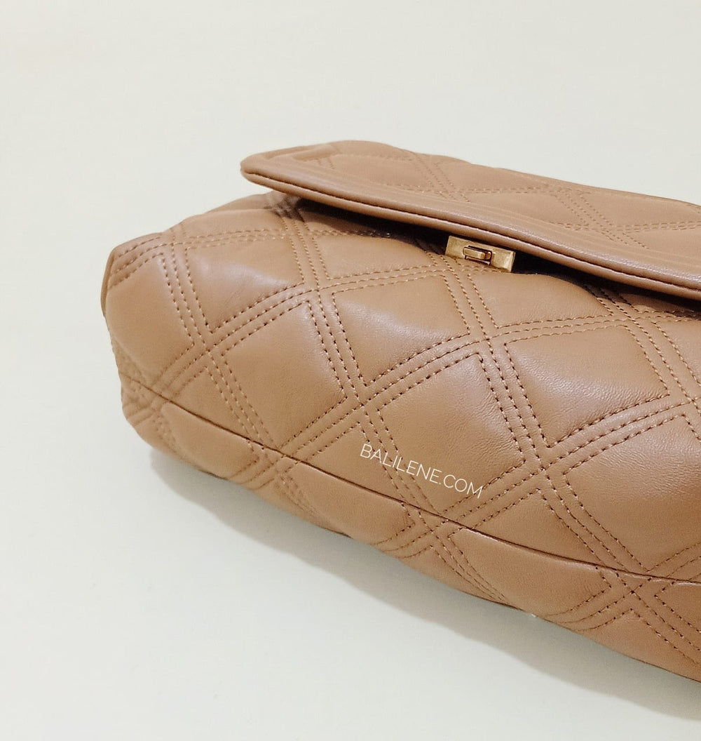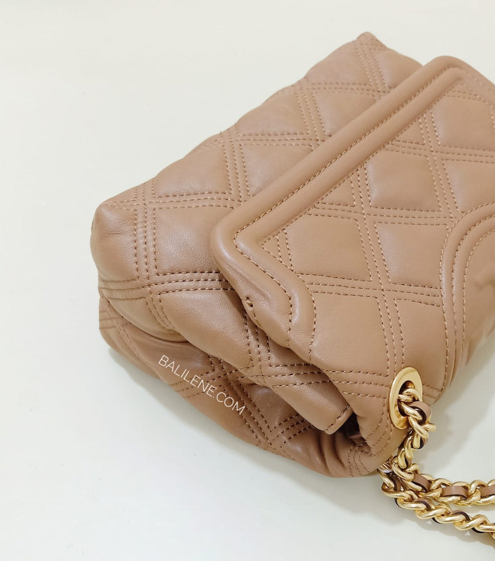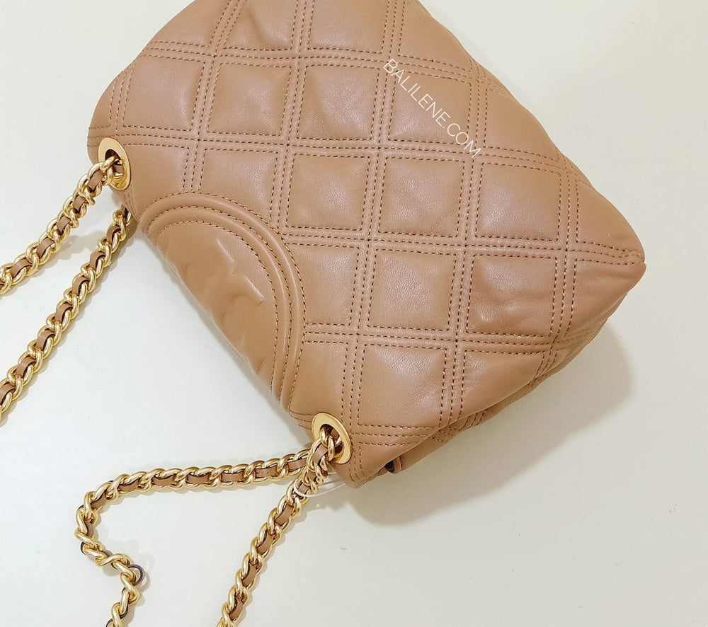 The Tory Burch 58102 Fleming Soft Small Convertible Shoulder Bag in Tiramisu features supple leather with signature quilting, offering both timeless style and versatility.