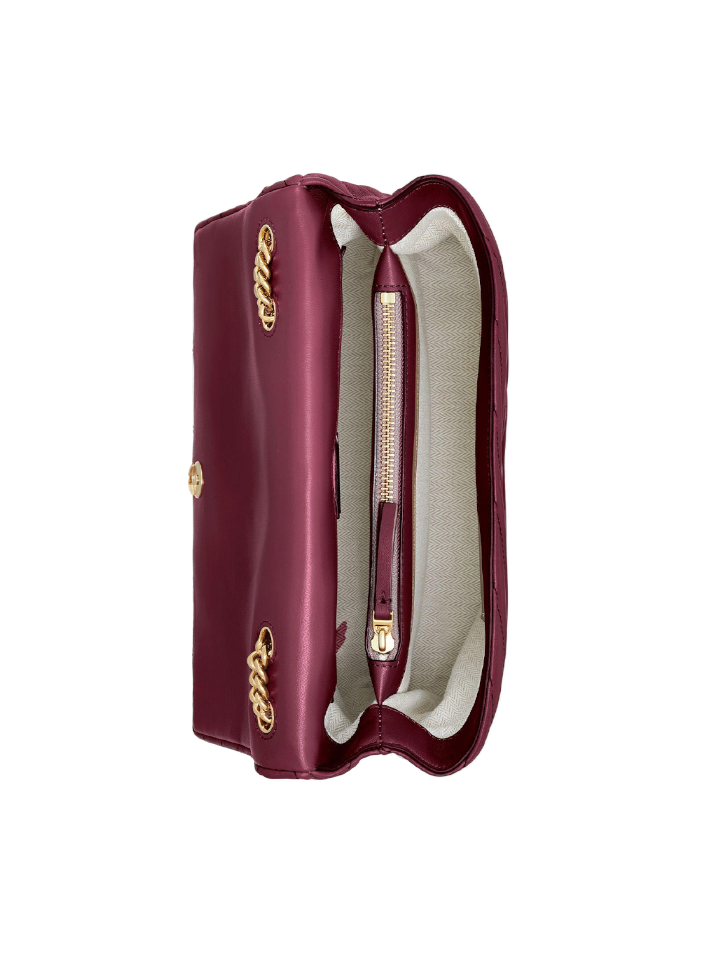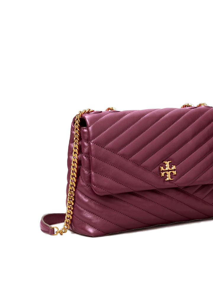This stunning bag from Tory Burch is perfect for carrying your essentials in style. Crafted from luxurious lambskin, it features a magnetic snap closure, an adjustable metal chain strap with a 20" drop, and two interior zipper pockets. The Kira Chevron Convertible Shoulder Bag comes in Imperial Garnet and is suitable for both iPhone 13 Pro Max and Samsung Galaxy Note 20.