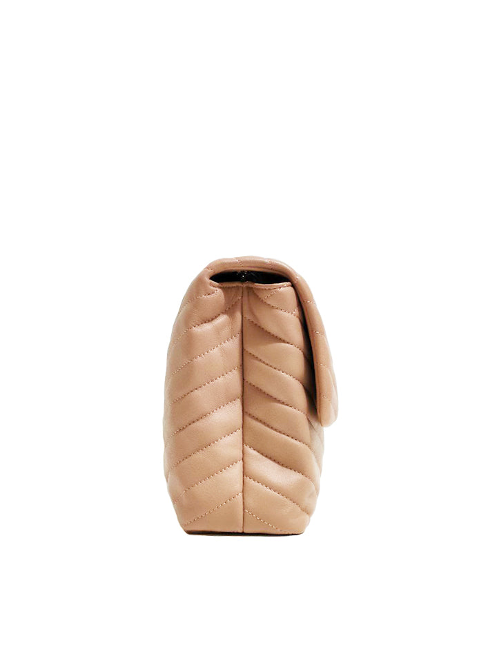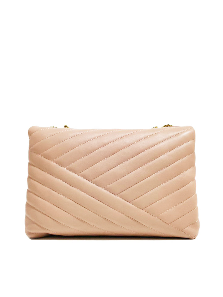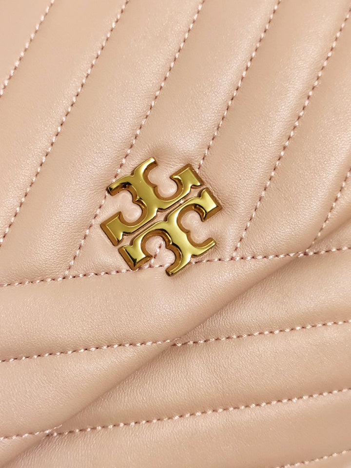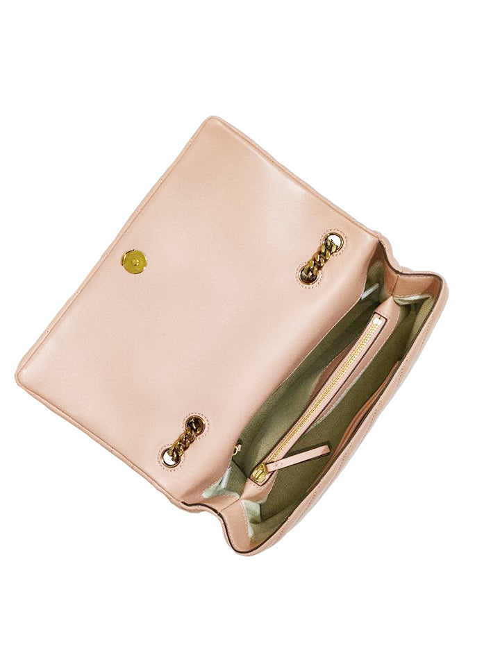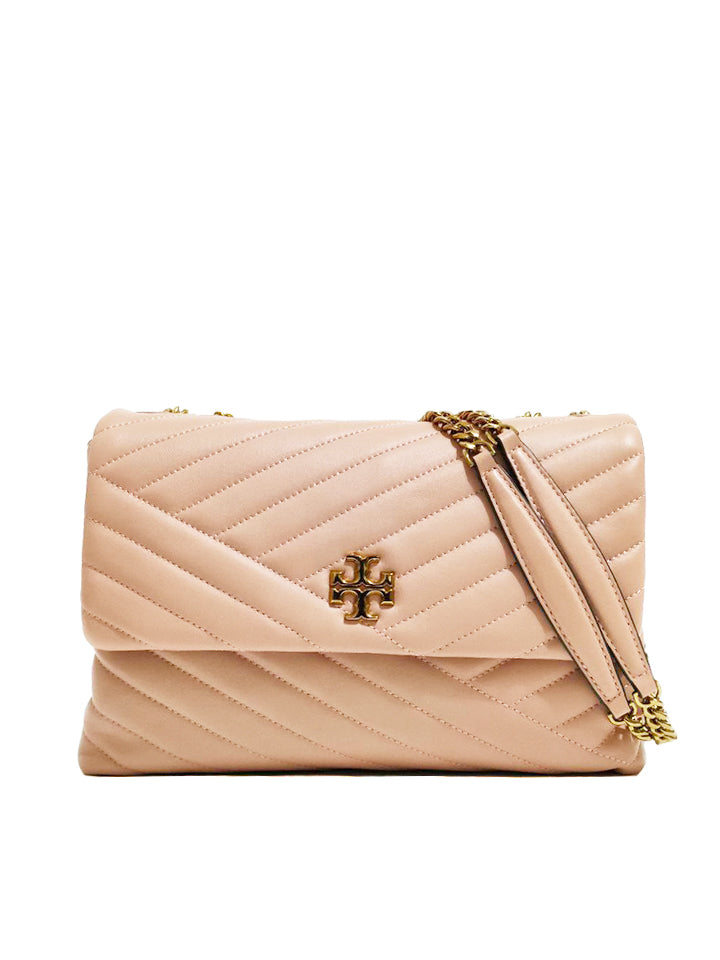Our Double T as beveled hardware: the Kira Convertible Shoulder Bag, in soft chevron-quilted leather, has an adjustable linked chain strap that can be worn doubled or long and crossbody.