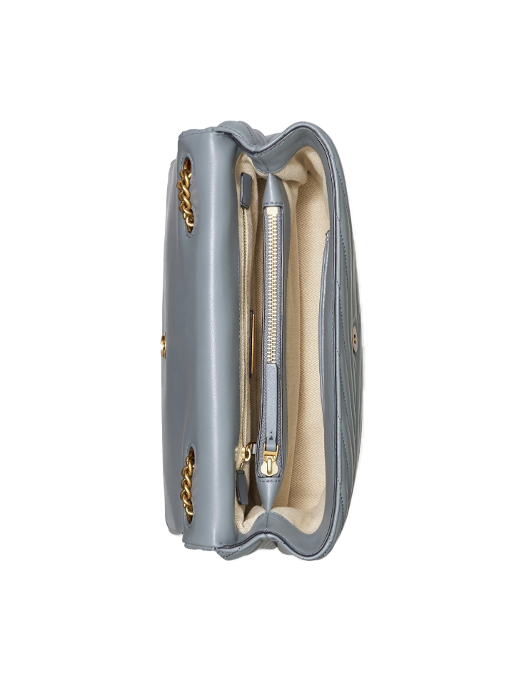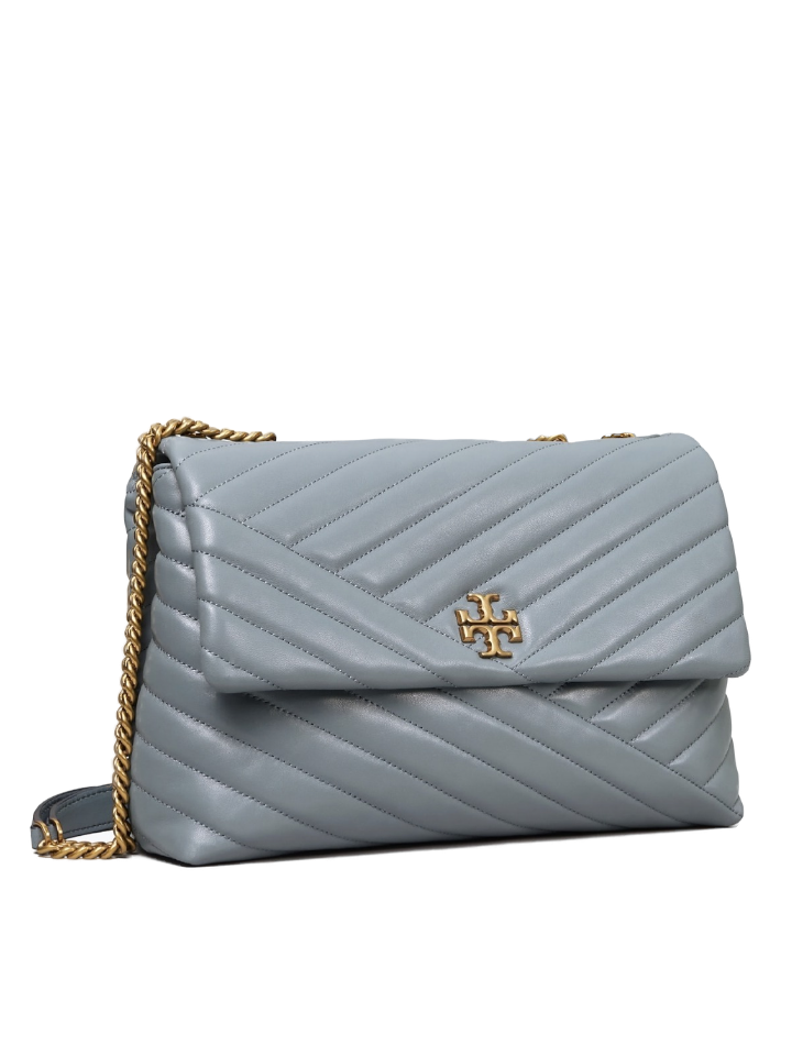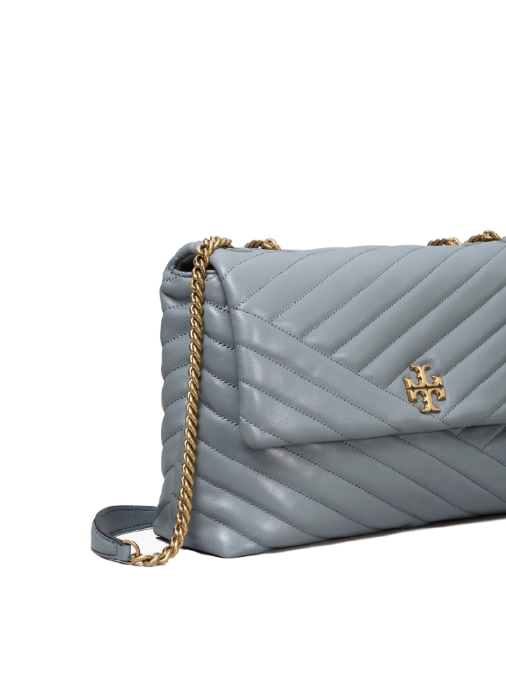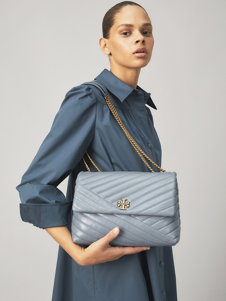 Our Double T as beveled hardware: the Kira Convertible Shoulder Bag, in soft chevron-quilted leather, has an adjustable linked chain strap that can be worn doubled or long and crossbody.