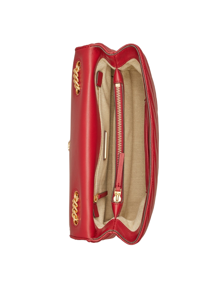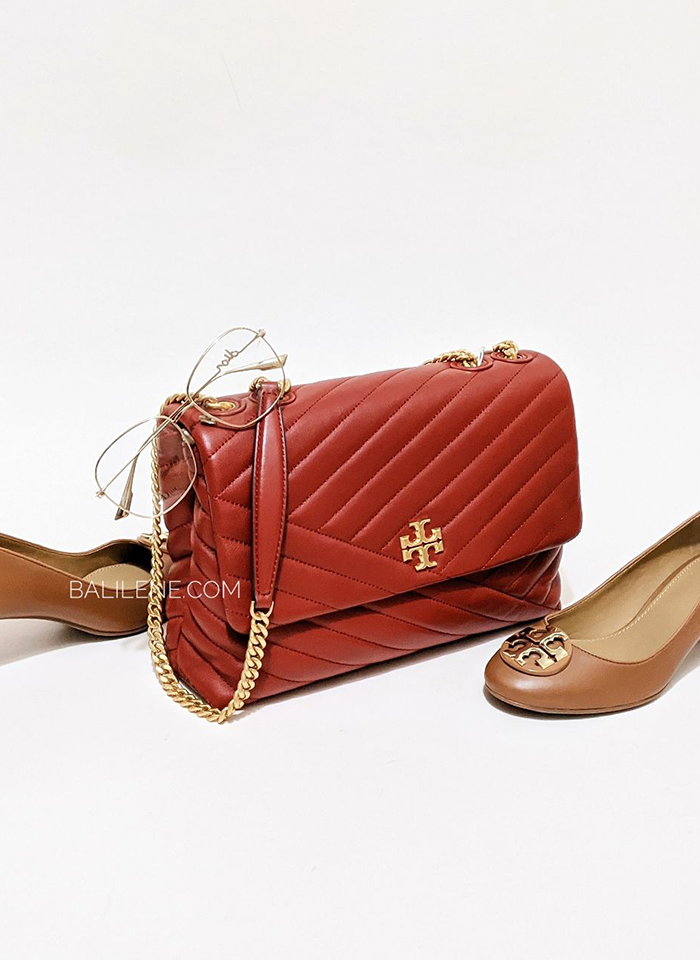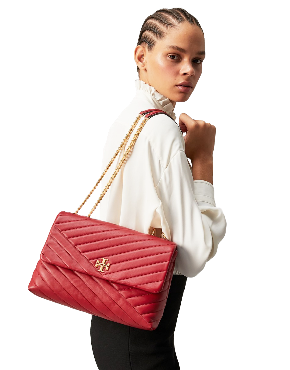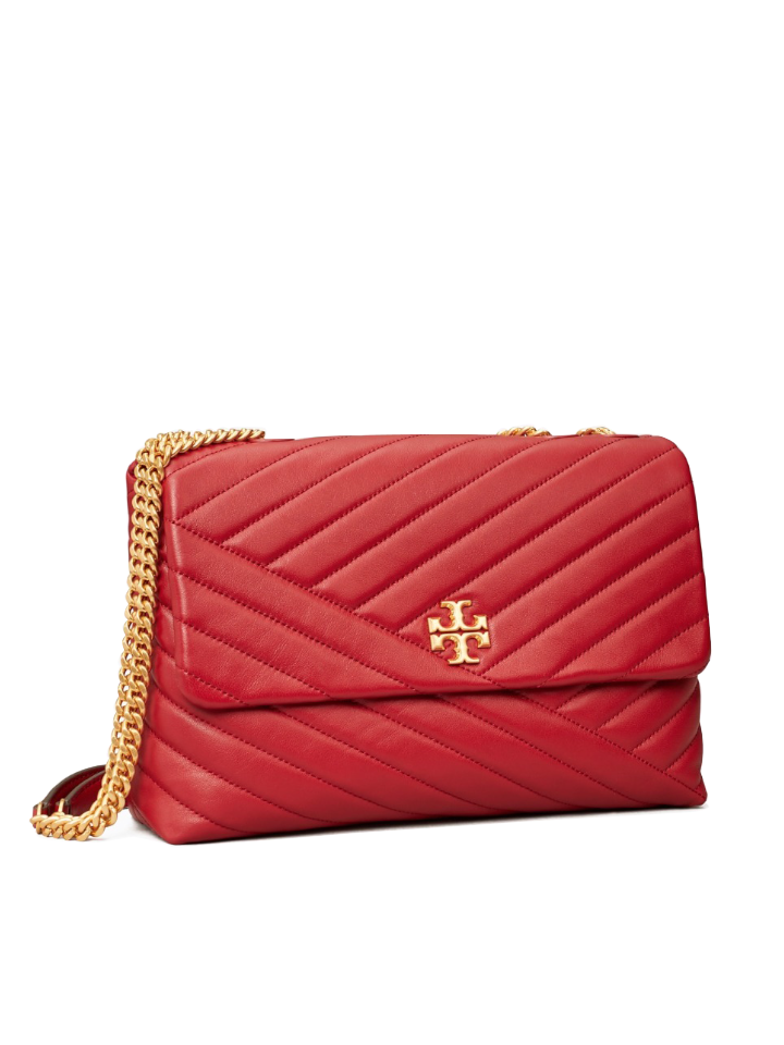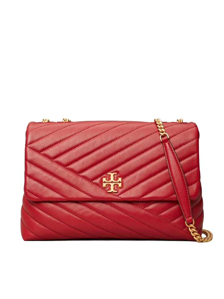 Our Double T as beveled hardware: the Kira Convertible Shoulder Bag, in soft chevron-quilted leather, has an adjustable linked chain strap that can be worn doubled or long and crossbody.