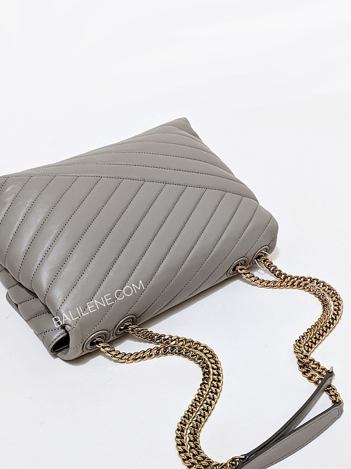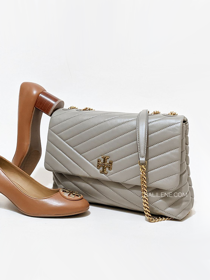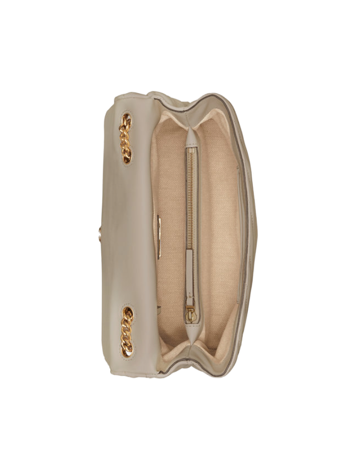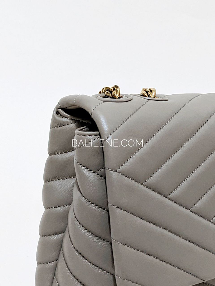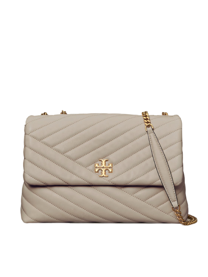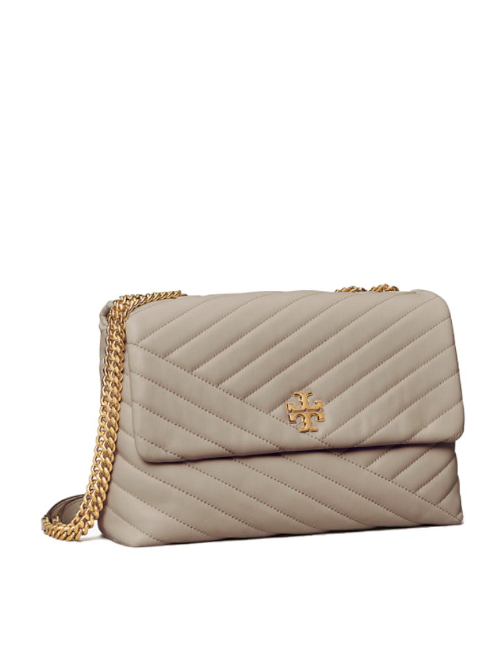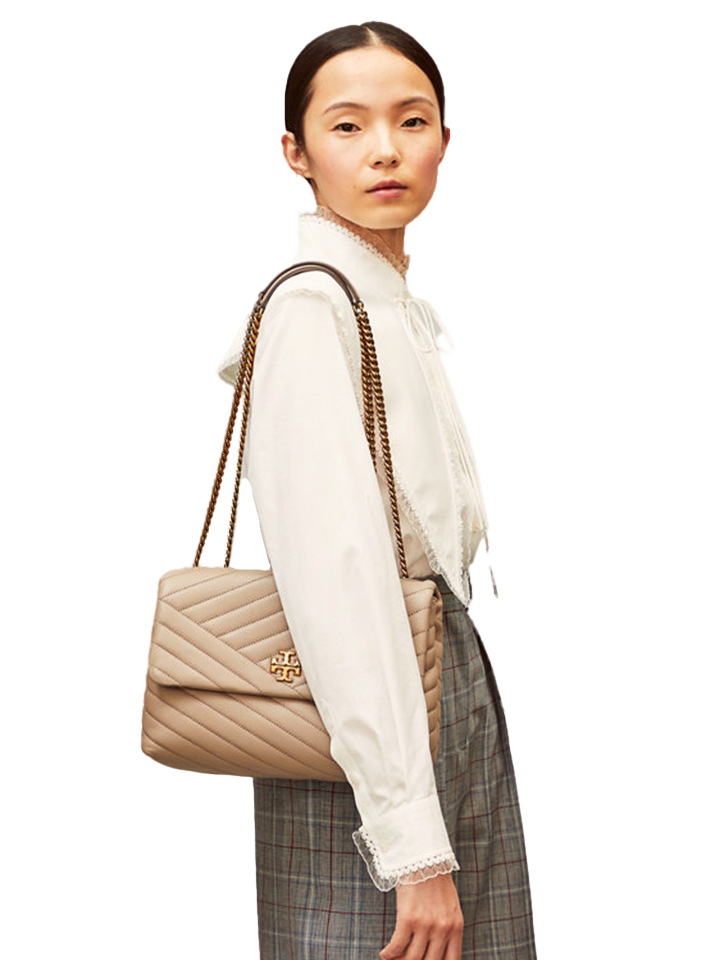 Our Double T as beveled hardware: the Kira Convertible Shoulder Bag, in soft chevron-quilted leather, has an adjustable linked chain strap that can be worn doubled or long and crossbody.